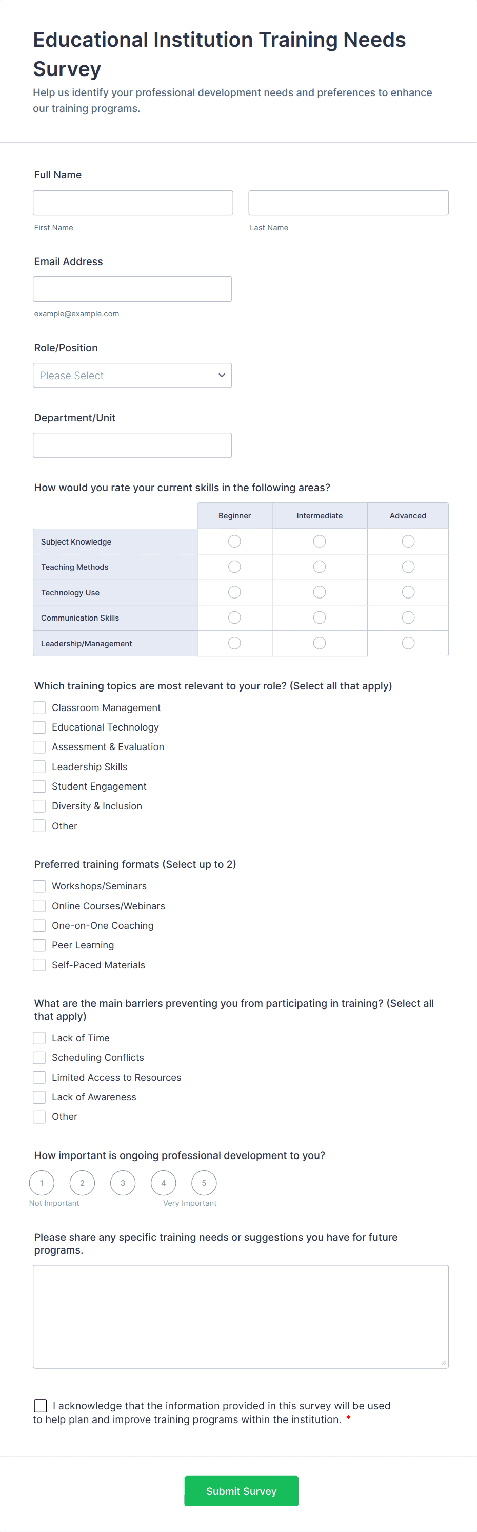Training Survey Templates are specialized survey forms designed to gather feedback, measure learning outcomes, and assess the effectiveness of training programs. These templates are commonly used by HR departments, corporate trainers, educational institutions, and professional development organizations to evaluate participant satisfaction, knowledge retention, and areas for improvement. Use cases range from post-training feedback surveys and pre-training needs assessments to skills gap analyses and trainer evaluations. By collecting structured feedback, organizations can refine their training content, delivery methods, and overall learning strategies to better meet the needs of their audience.