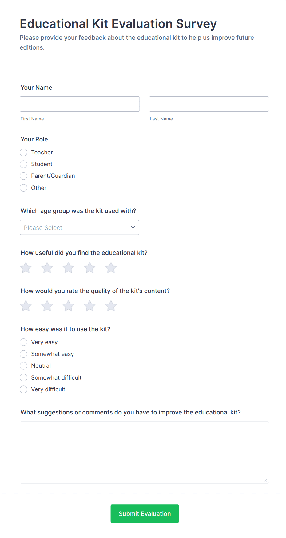 • For teacher or staff surveys: Include self-assessment fields, peer review sections, and narrative response options.