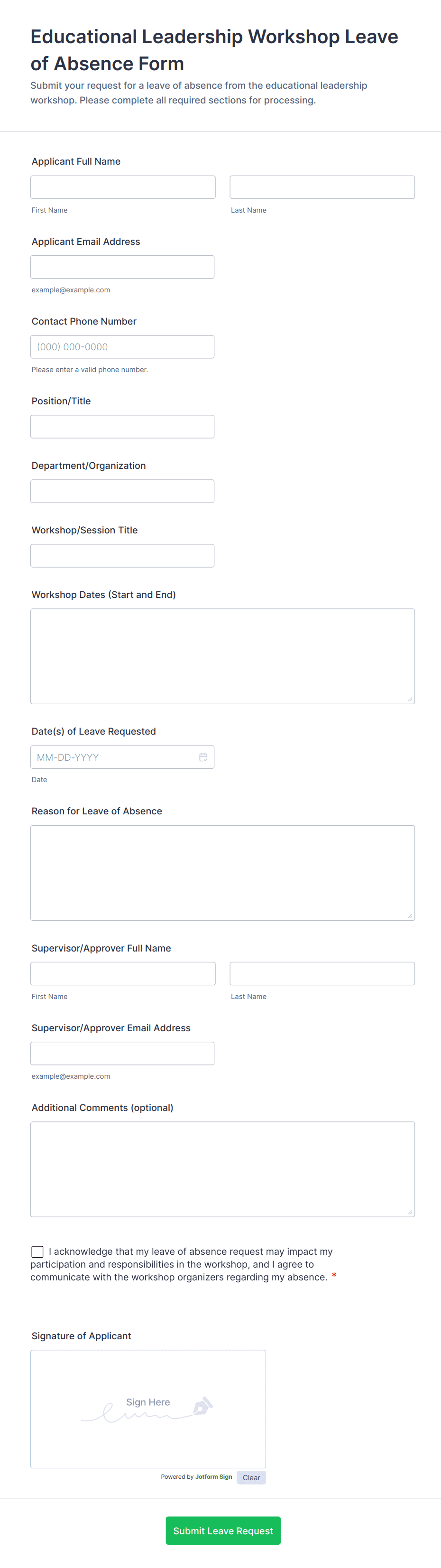 - Use Jotform’s conditional logic to show or hide fields based on the type of leave selected.