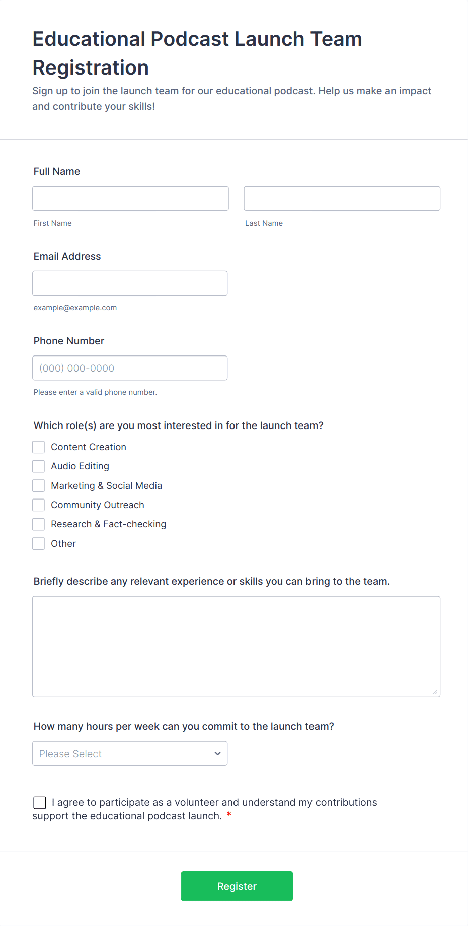 • Volunteer Sign Up: Can include availability, skills, and emergency contact fields.