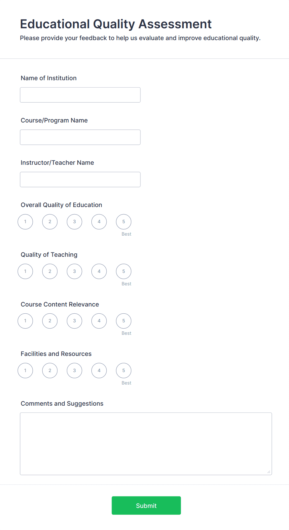 • Short and long text fields for open-ended feedback.