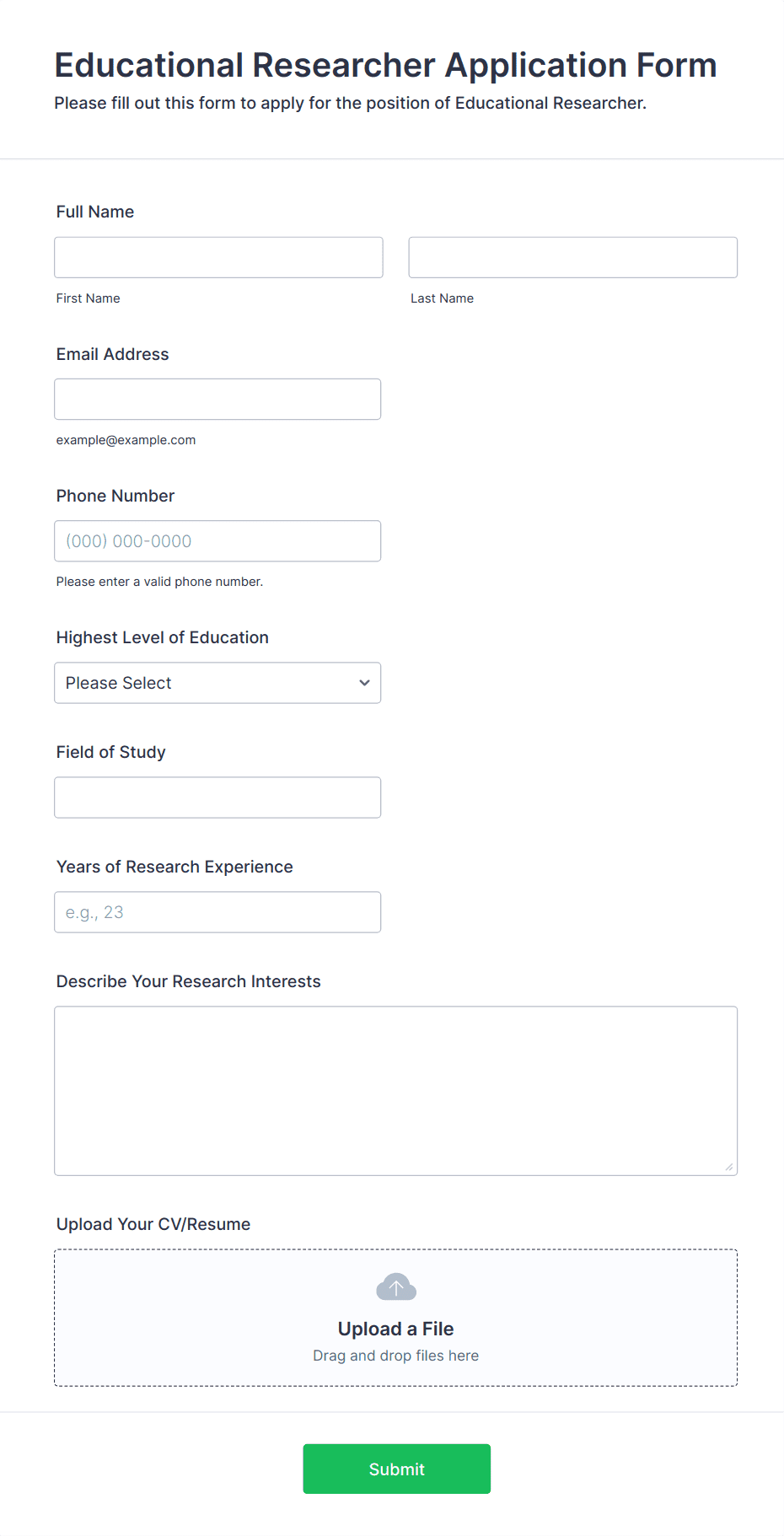 • For job applications, include fields for personal information, education, work experience, references, and file uploads for resumes or cover letters.
