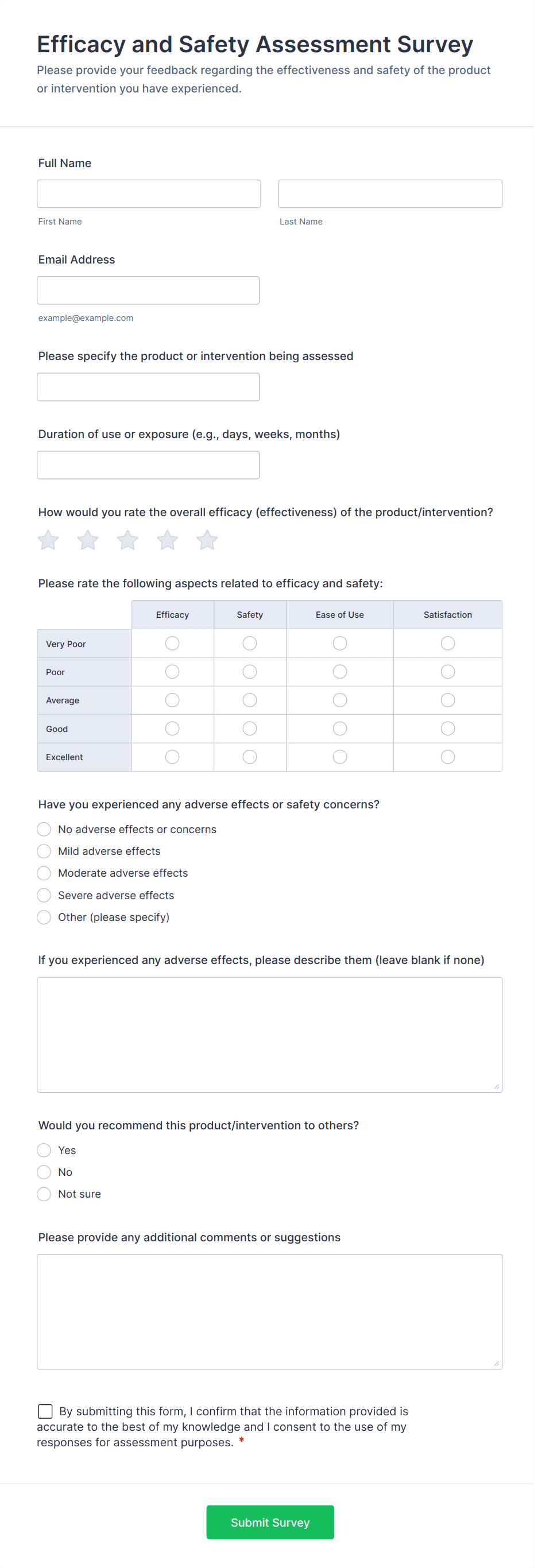 - Short and long text fields for open-ended feedback.
