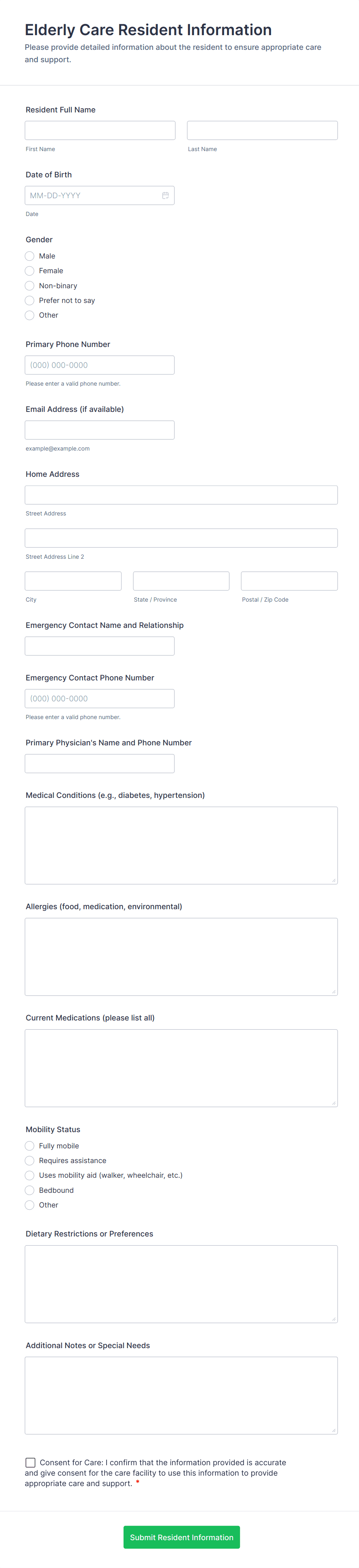 Common fields include contact information, background details, specific needs or preferences, consent or agreement signatures, and any relevant supporting documents.