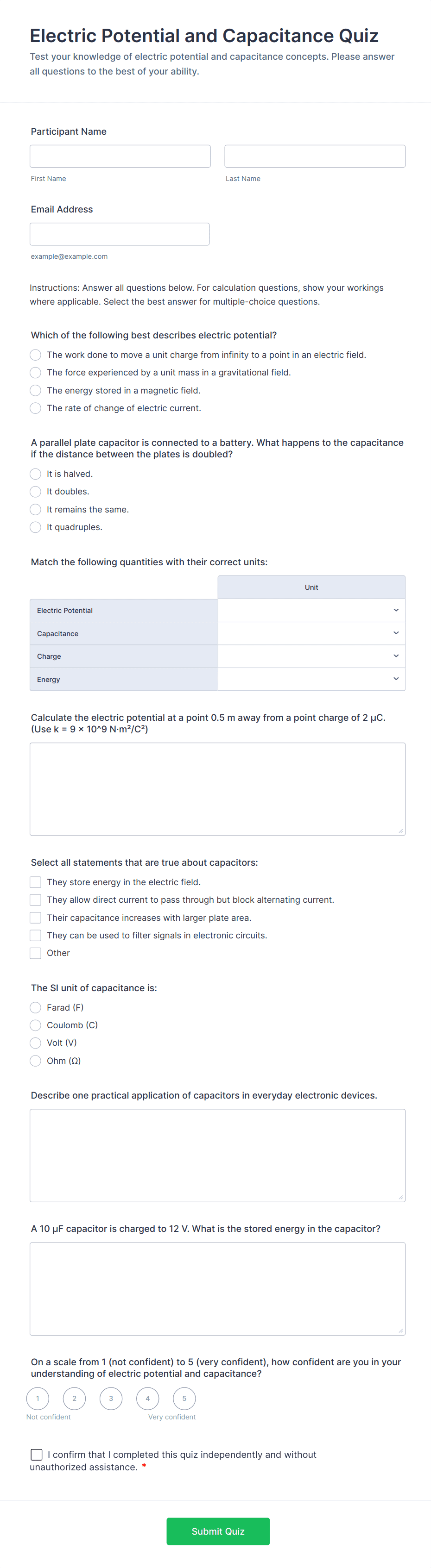 Quiz Templates are pre-designed forms specifically created to facilitate the process of building quizzes for a variety of purposes, such as education, employee training, lead generation, event engagement, and more. These templates provide a structured way to present questions, collect answers, and automatically score or evaluate responses. Whether you’re a teacher assessing student knowledge, a business running a product knowledge test, or a marketer creating a fun personality quiz, Quiz Templates offer a flexible foundation to suit your needs. They can be used for online exams, trivia games, onboarding assessments, customer feedback quizzes, and interactive learning modules.
