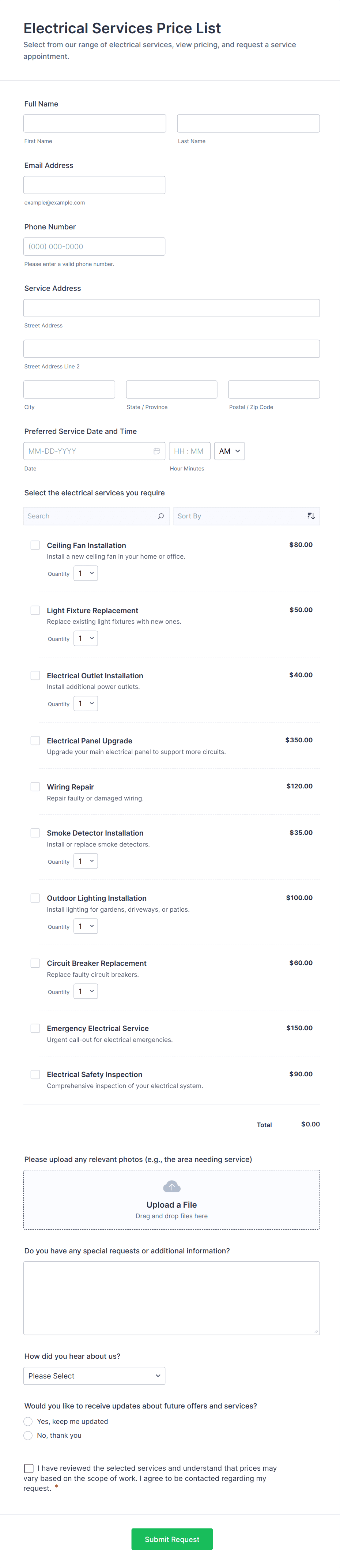 Electrical Services Price List Form Template for electricians and contractors to collect service requests, schedule preferences, and pricing inquiries through Jotform for faster data collection and organized form submissions.
