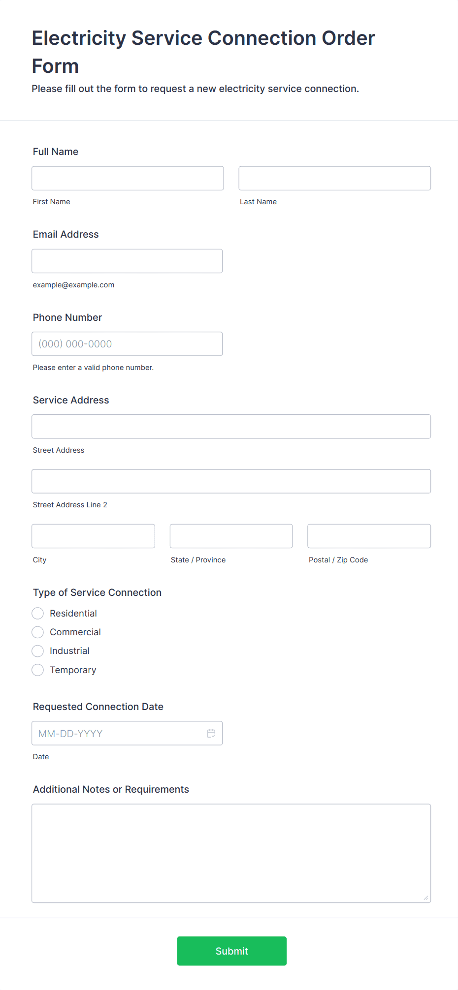 • For service orders, include fields like date/time pickers, dropdowns for service types, and text fields for special instructions.