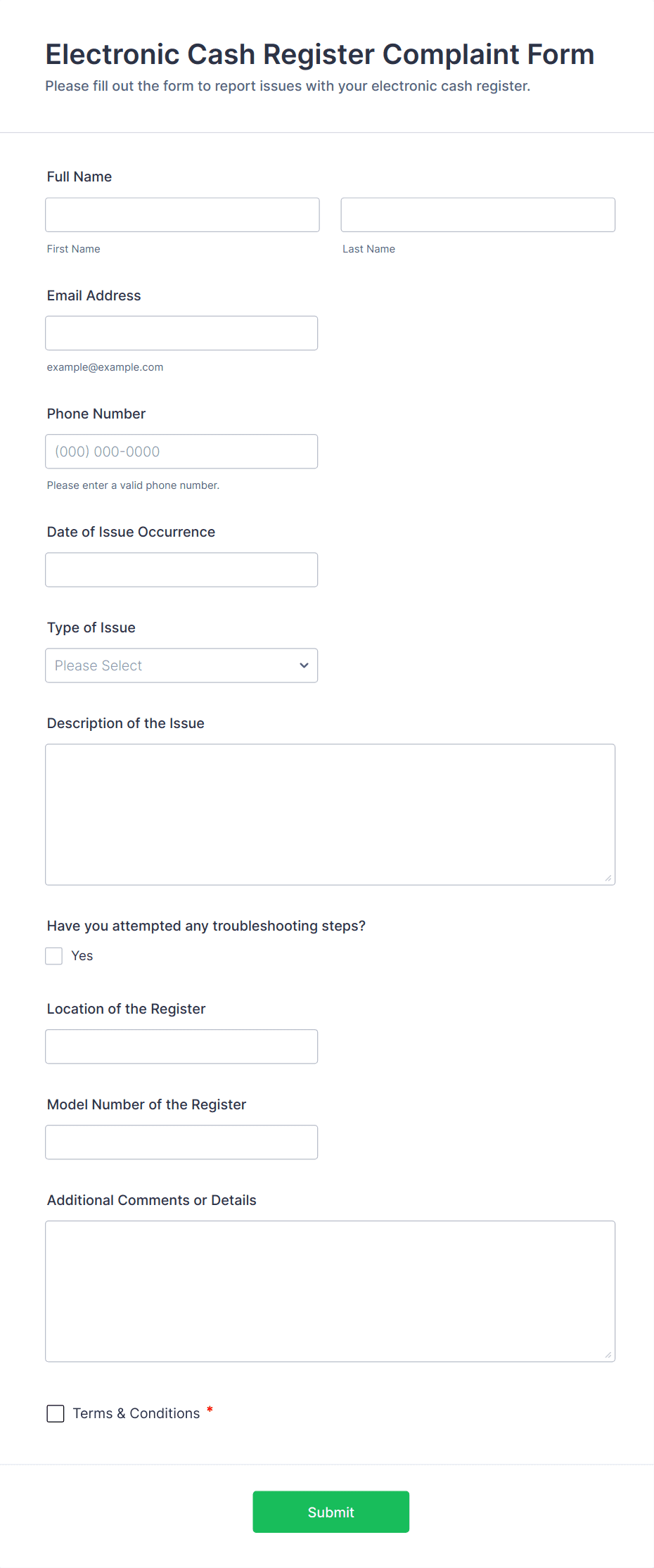 • Conditional Logic: Certain fields may appear only if specific options are selected (e.g., type of complaint).