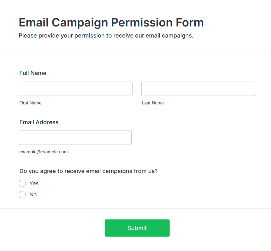 Email marketing forms are specialized online forms designed to collect, manage, and segment email addresses and related information for marketing campaigns. These forms are essential tools for businesses, organizations, and marketers aiming to grow their subscriber lists, nurture leads, and engage audiences through targeted email communications. Common use cases include newsletter sign-ups, event invitations, lead generation, feedback collection, promotional offers, and customer onboarding. By capturing key details such as names, preferences, and consent, email marketing forms help ensure that your communications reach the right people with relevant content.