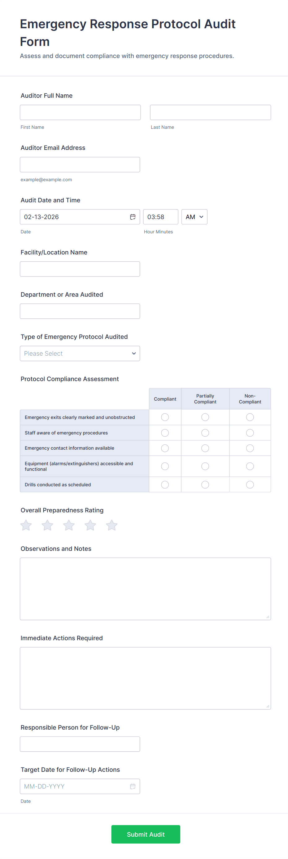 • Customize fields based on your audit type (e.g., safety, quality, compliance).