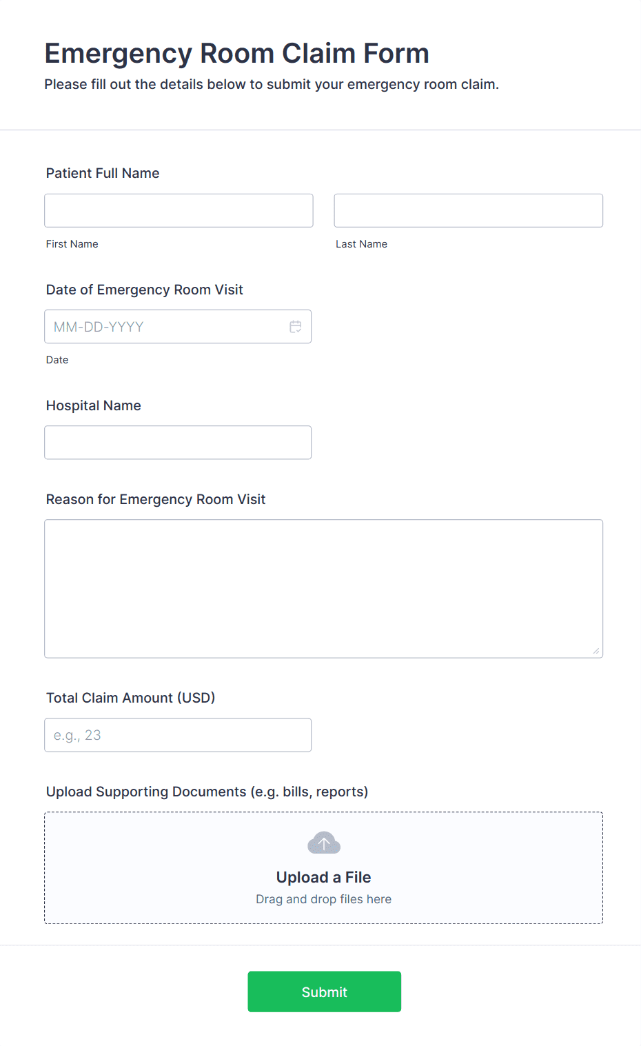 • Medical Fields: Medical history, allergies, current medications, insurance details.