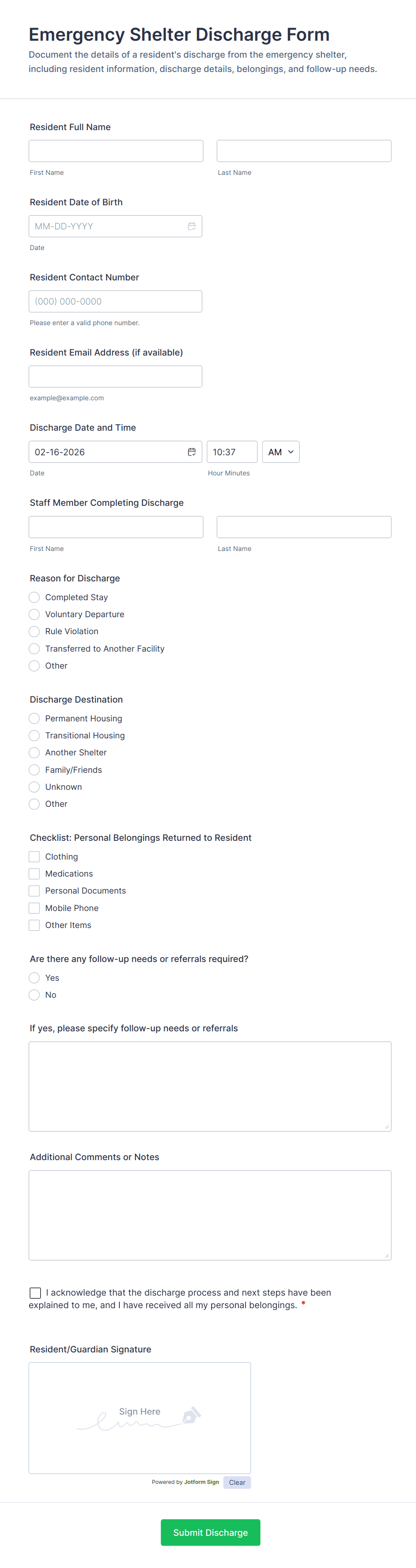 Yes, discharge forms often contain sensitive information and should be handled in accordance with privacy laws and organizational policies. Using secure platforms like Jotform helps ensure data protection and confidentiality.