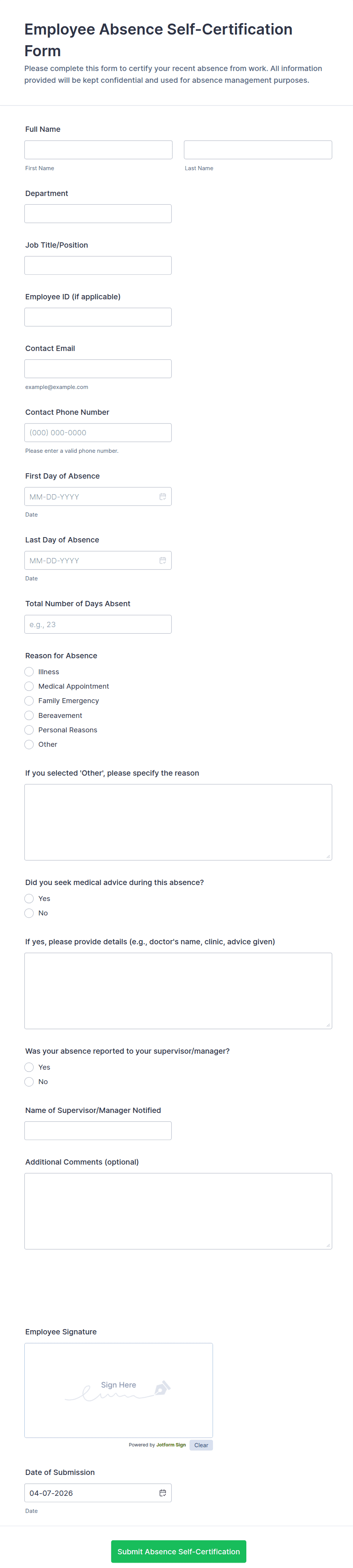 Common fields include employee name, department, type of leave, dates of absence, reason for leave, and any required supporting documentation.