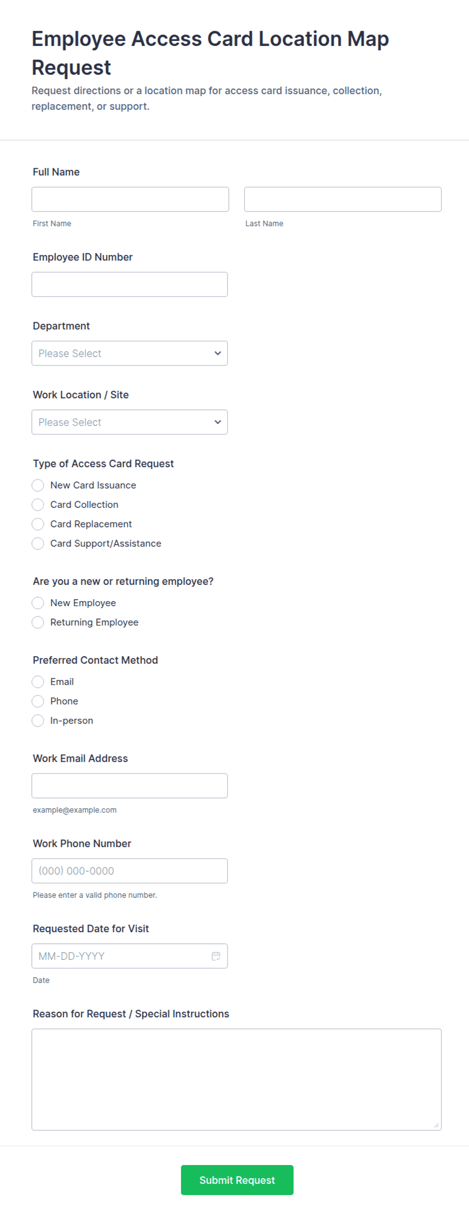 Collect requester name, department, contact info, and access type (physical, system, visitor). Include the reason for access and requested dates.