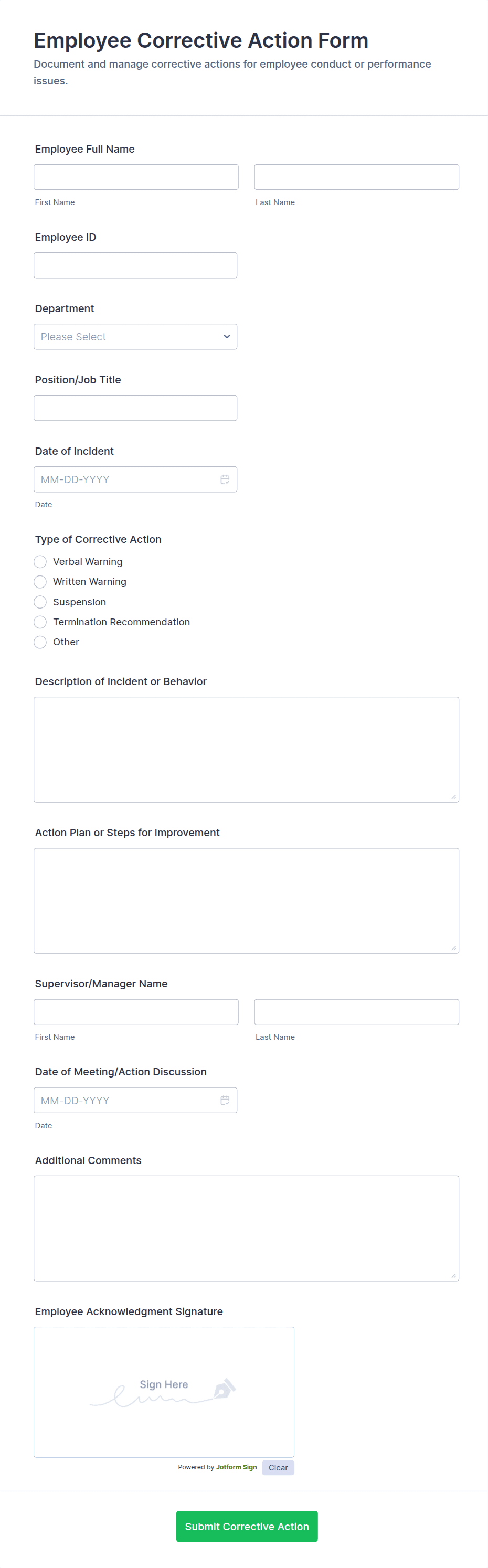 Disciplinary forms are used by employers or HR departments to make reports of complaints, warnings, or disciplinary actions. Using these ready-made form templates from Jotform, your company can make the switch from messy paper forms to powerful online disciplinary forms that can be filled out on any device and securely stored in your Jotform account.