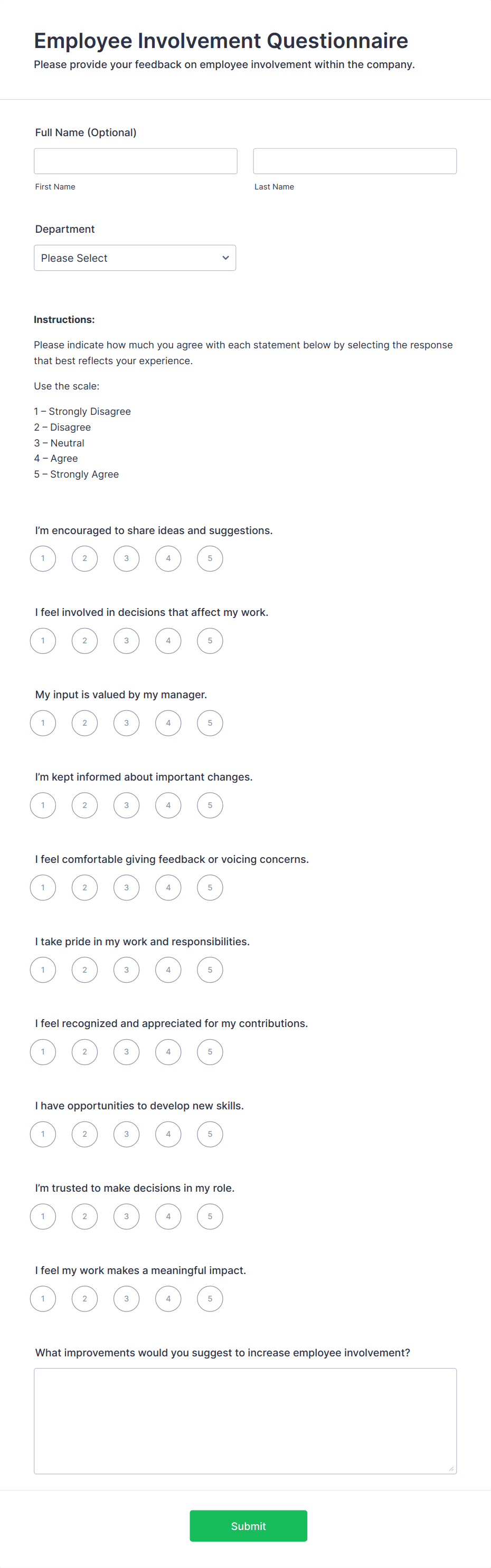 • For engagement surveys, include questions about job satisfaction, leadership, and work environment.