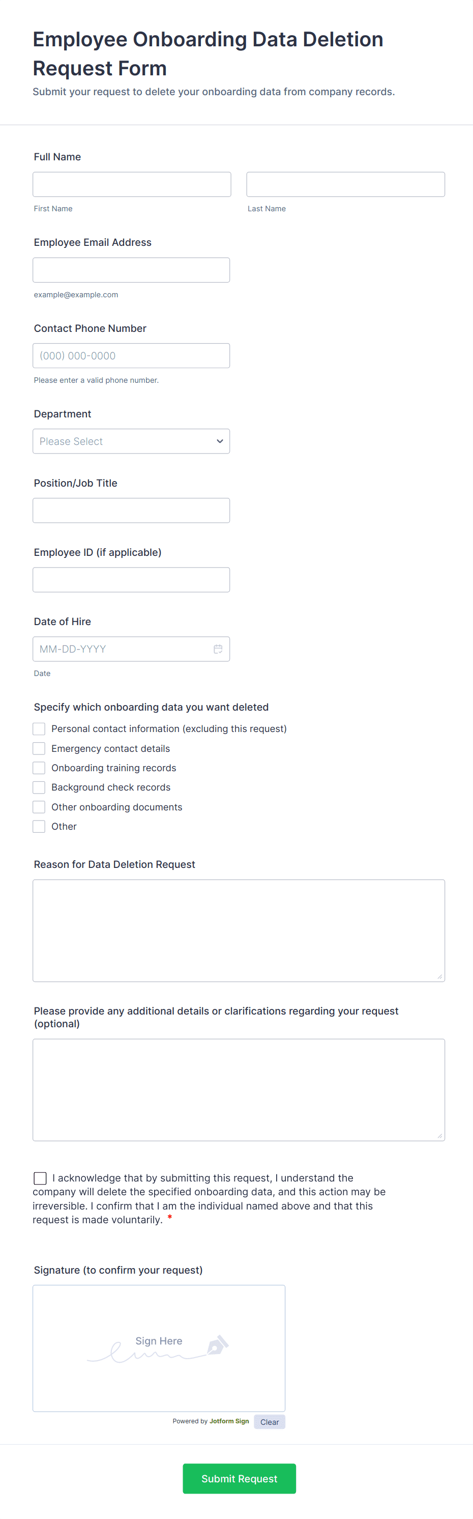 - Employee onboarding: May require fields for personal details, tax forms, emergency contacts, and policy acknowledgments.