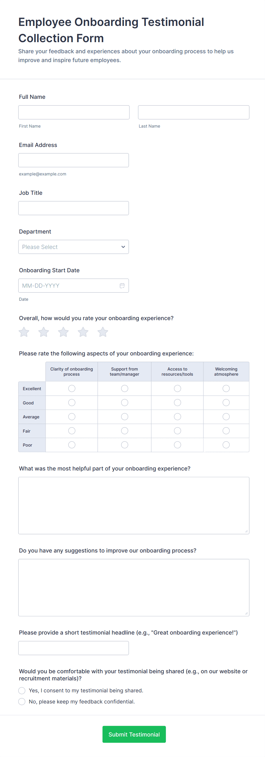 An Onboarding Feedback Questionnaire is a form template designed to gather actionable insights that enable organizations to continuously improve their onboarding processes, enhance employee engagement and retention, and ensure alignment with company culture and values.