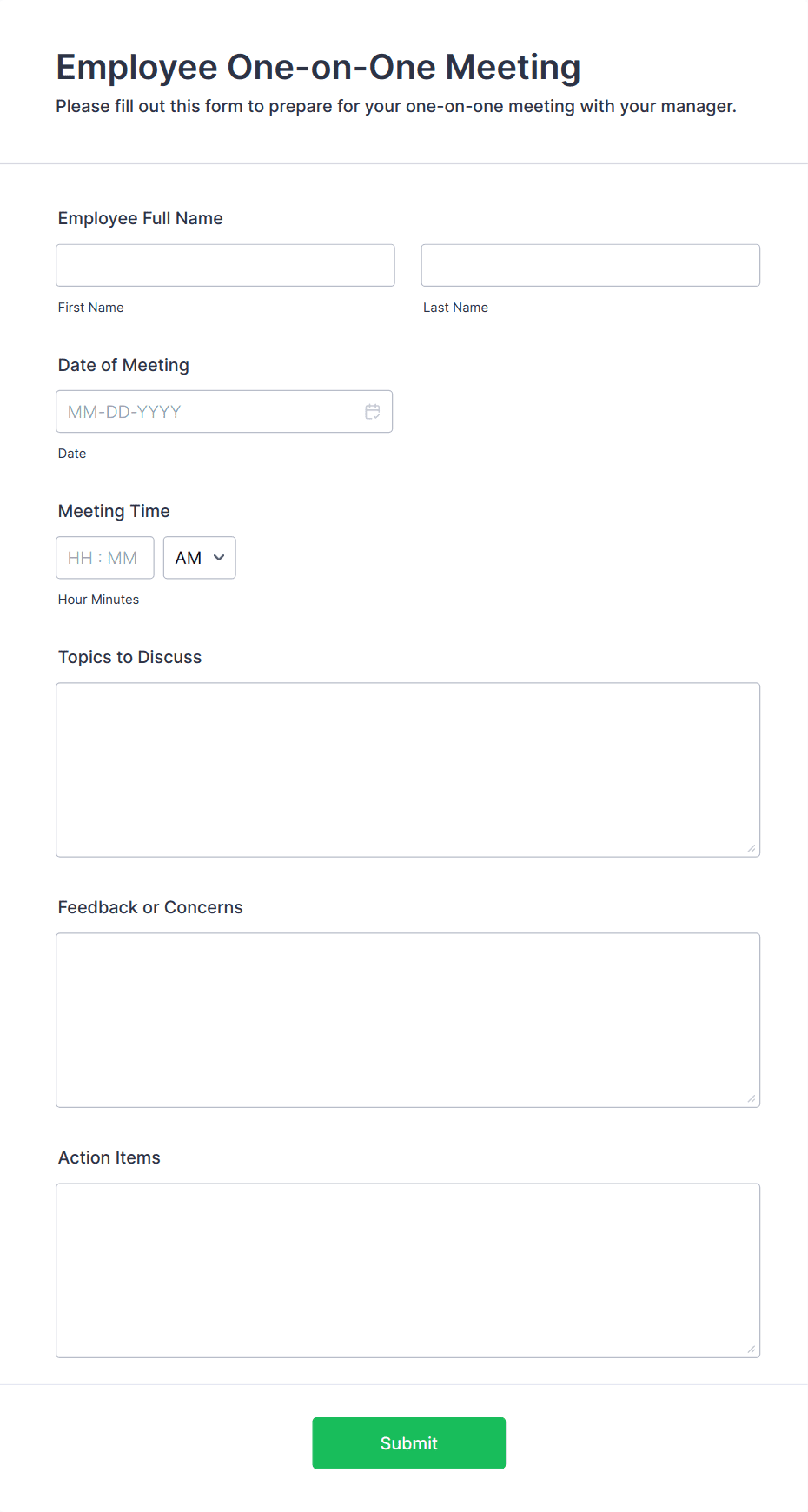 An Employee Performance Evaluation Form is a form template designed to track individual performance, monitor employee progress, and provide detailed feedback to employees.