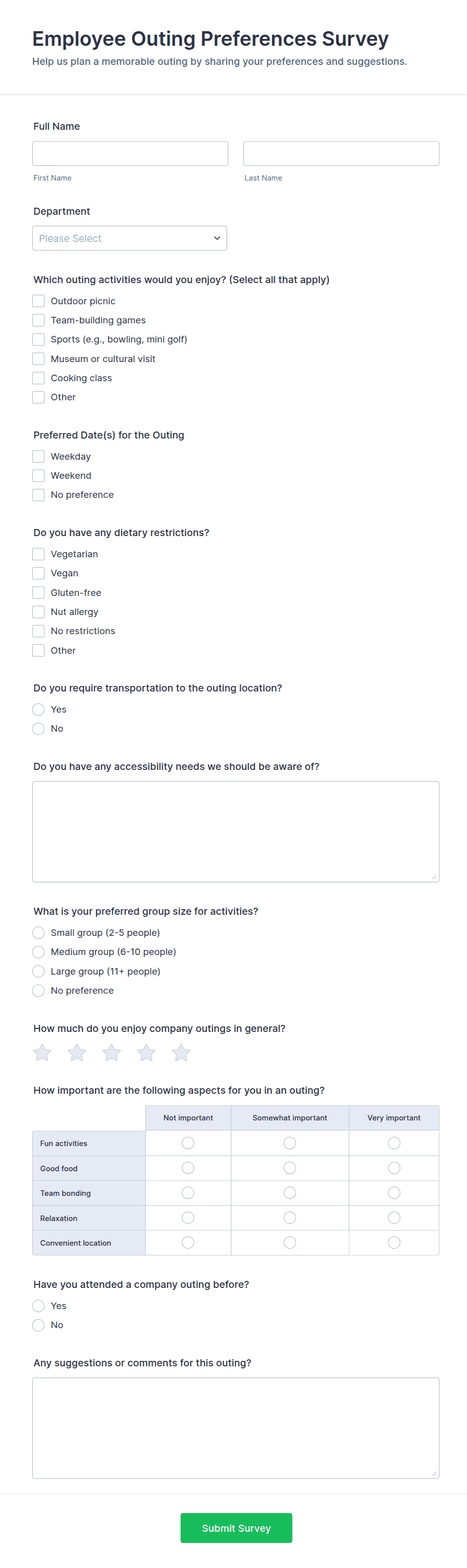 • For onboarding or exit surveys, add fields about the hiring process, training, or reasons for leaving.