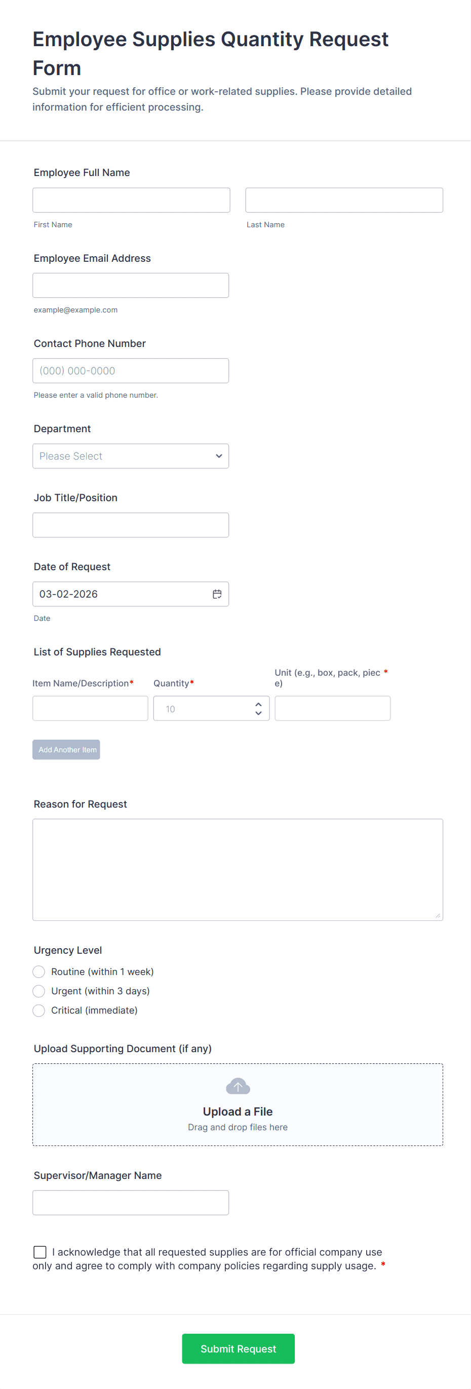 • Medical Supplies: Might require supplier information, urgency level, and compliance checkboxes.