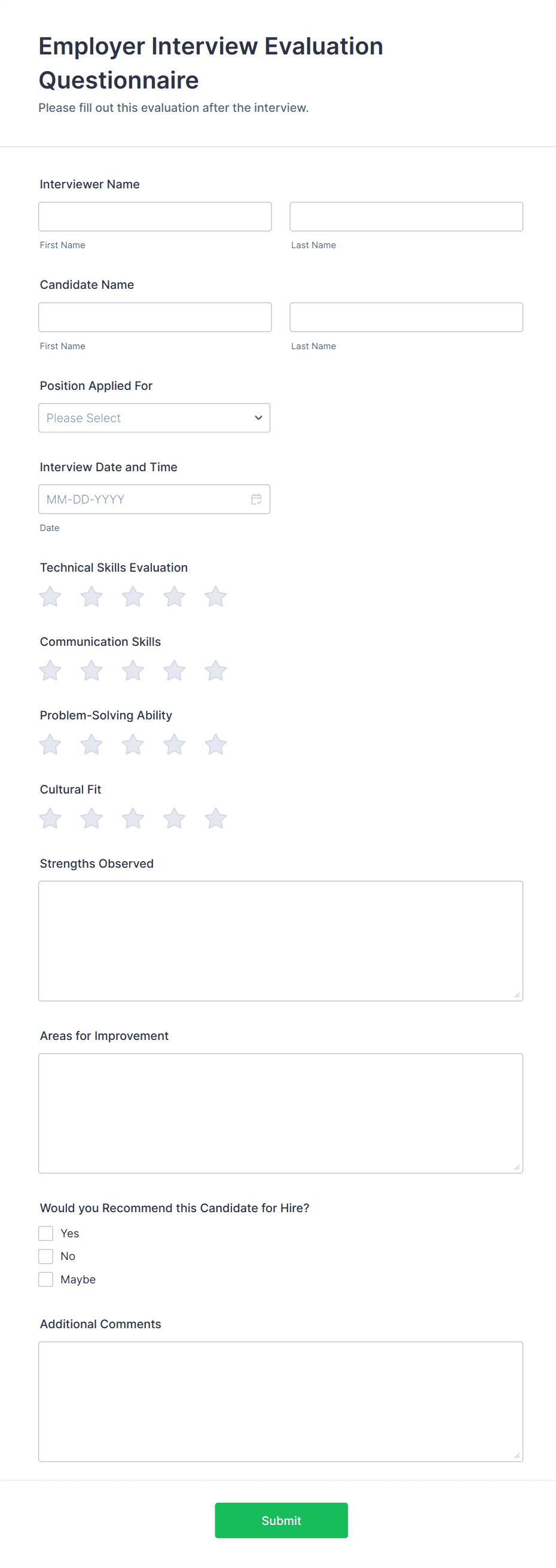 An interview form is a structured document or digital tool used to collect information from individuals during interviews. It standardizes the questions and response formats, ensuring consistency and efficiency in data collection.