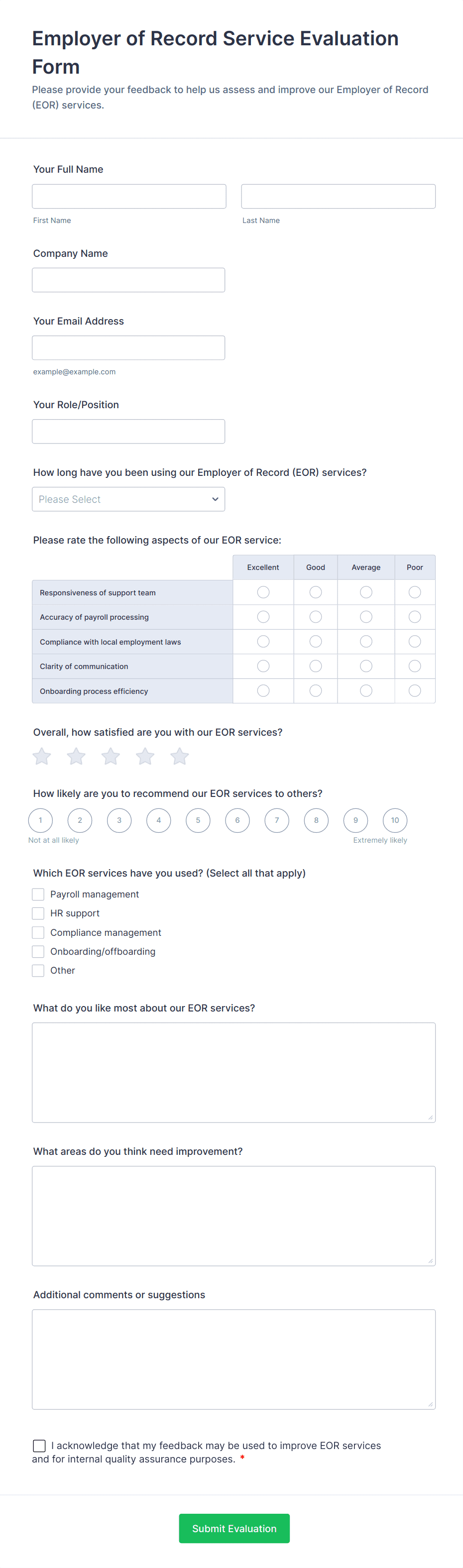 By following these steps, you can create a Service Evaluation Form that not only collects meaningful feedback but also streamlines your evaluation process, helping you deliver better services and foster continuous improvement.