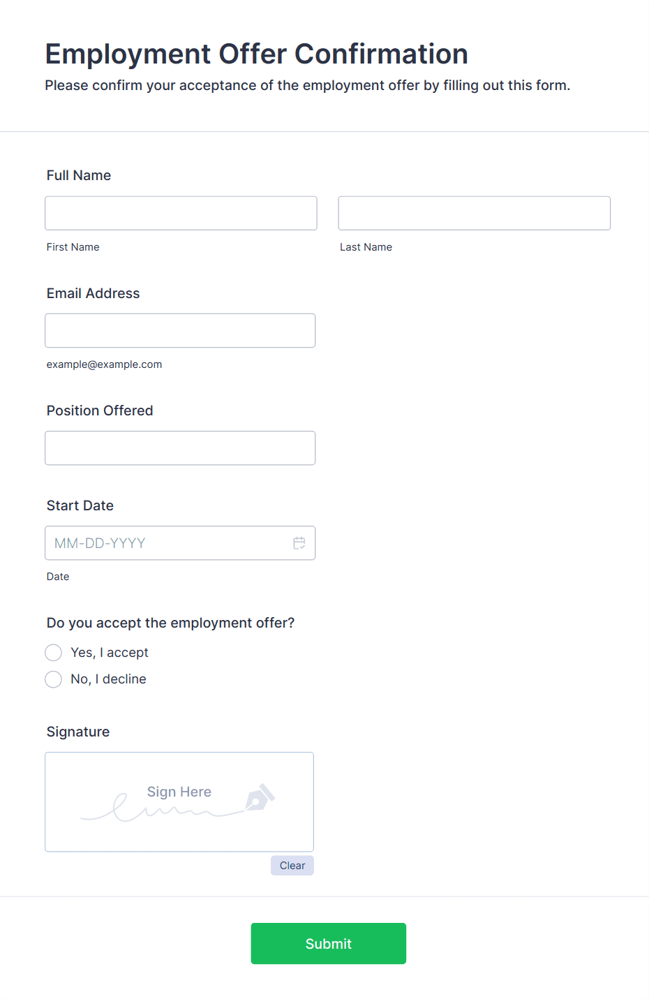 Employment forms are essential documents used throughout the employee lifecycle, from recruitment and onboarding to performance evaluation and offboarding. These forms help organizations collect, organize, and manage critical information such as job applications, interview feedback, background checks, new hire paperwork, timesheets, performance reviews, and exit interviews. By standardizing the data collection process, employment forms ensure compliance with company policies and legal requirements, streamline HR workflows, and improve communication between employers and employees. Whether you’re a small business owner, HR manager, or recruiter, employment forms are vital for maintaining accurate records and supporting efficient human resource management.