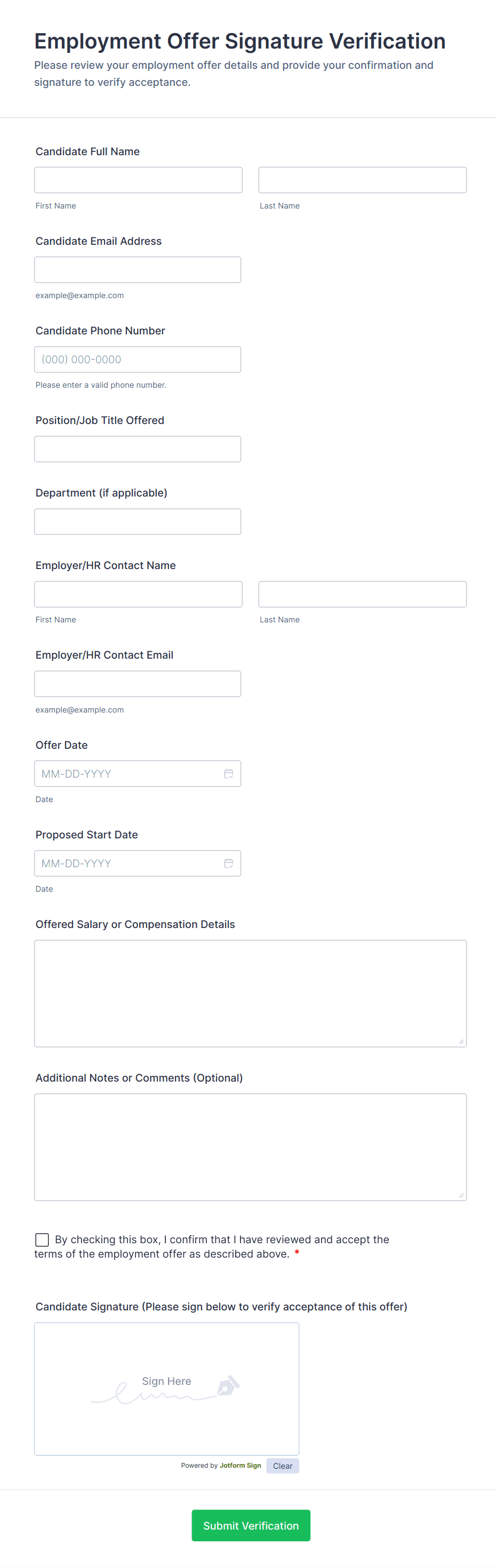 Verification forms are specialized digital tools designed to authenticate, validate, or confirm information provided by individuals or organizations. These forms are commonly used to verify identities, credentials, employment status, addresses, or other critical data points in a secure and efficient manner. Typical use cases include onboarding new employees, confirming student enrollment, validating customer identities for financial services, or ensuring the accuracy of submitted documents in compliance processes. By streamlining the verification process, these forms help organizations reduce fraud, maintain regulatory compliance, and build trust with their stakeholders.