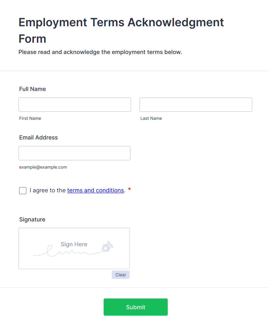 - Employee onboarding: May require fields for personal details, tax forms, emergency contacts, and policy acknowledgments.