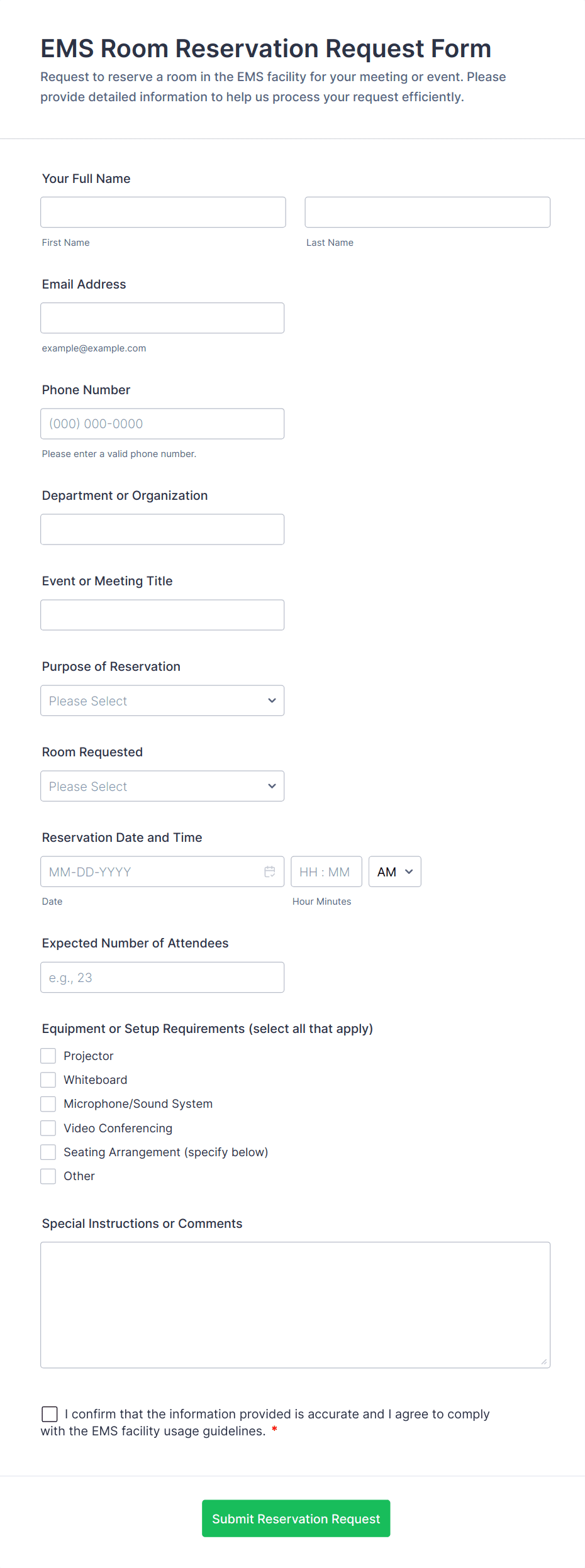 - Restaurants: Forms may include party size, preferred seating, dietary restrictions, and special requests.