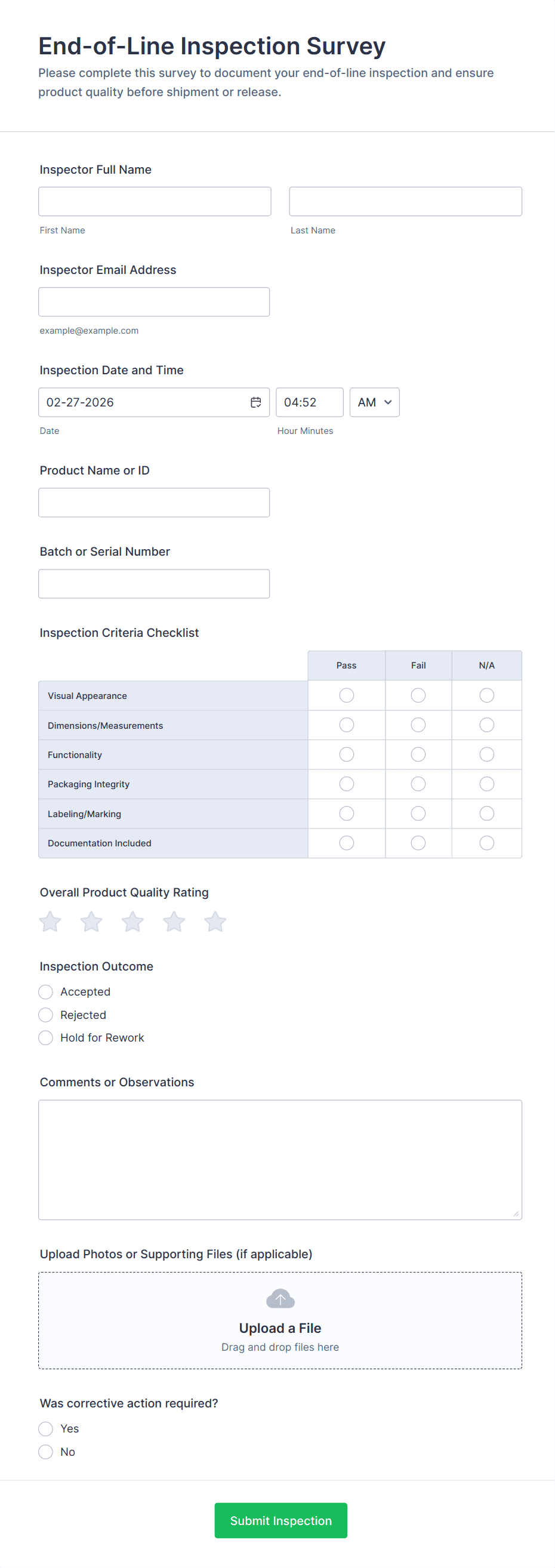 - File upload fields for supporting documentation (useful in audits or supplier evaluations).