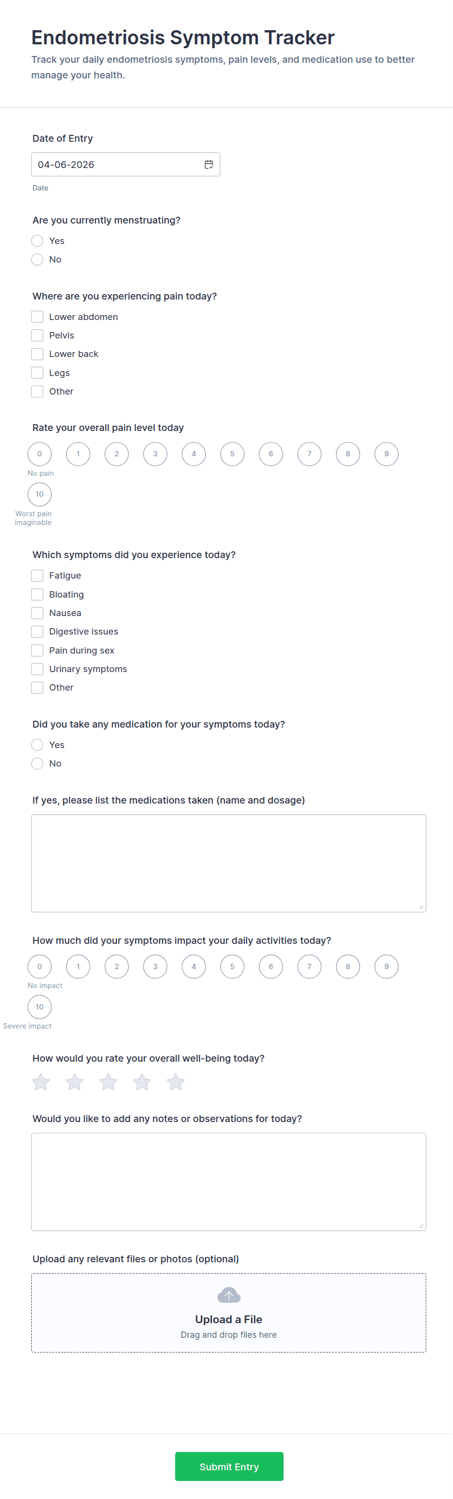 - For symptom tracking: date pickers, checkboxes for symptoms, pain scales, and comment boxes.