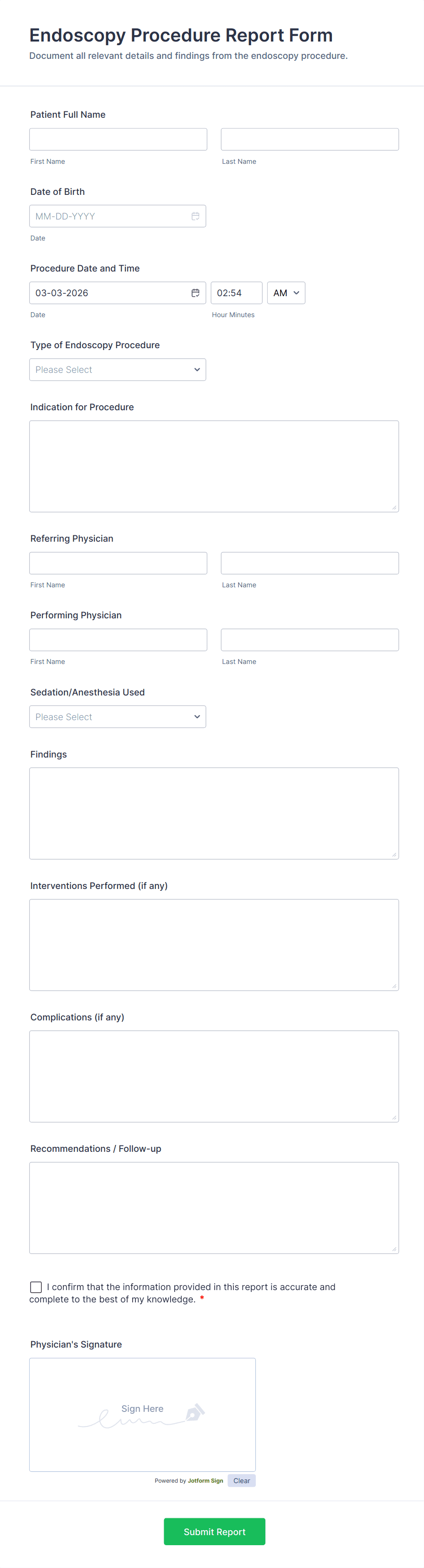 Medical Report Form is a form template that enables healthcare providers to capture, store, and manage patient information efficiently using Jotform's intuitive interface, promoting seamless health records management.