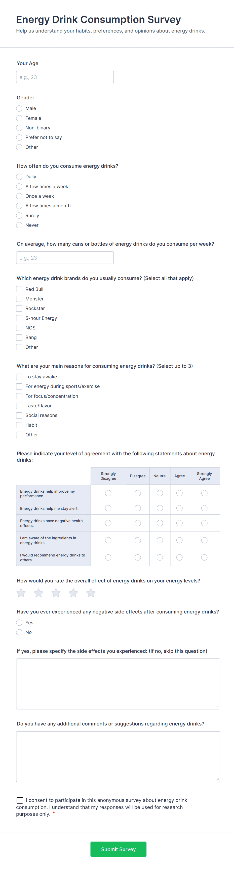 • Short and long text fields for open-ended feedback.