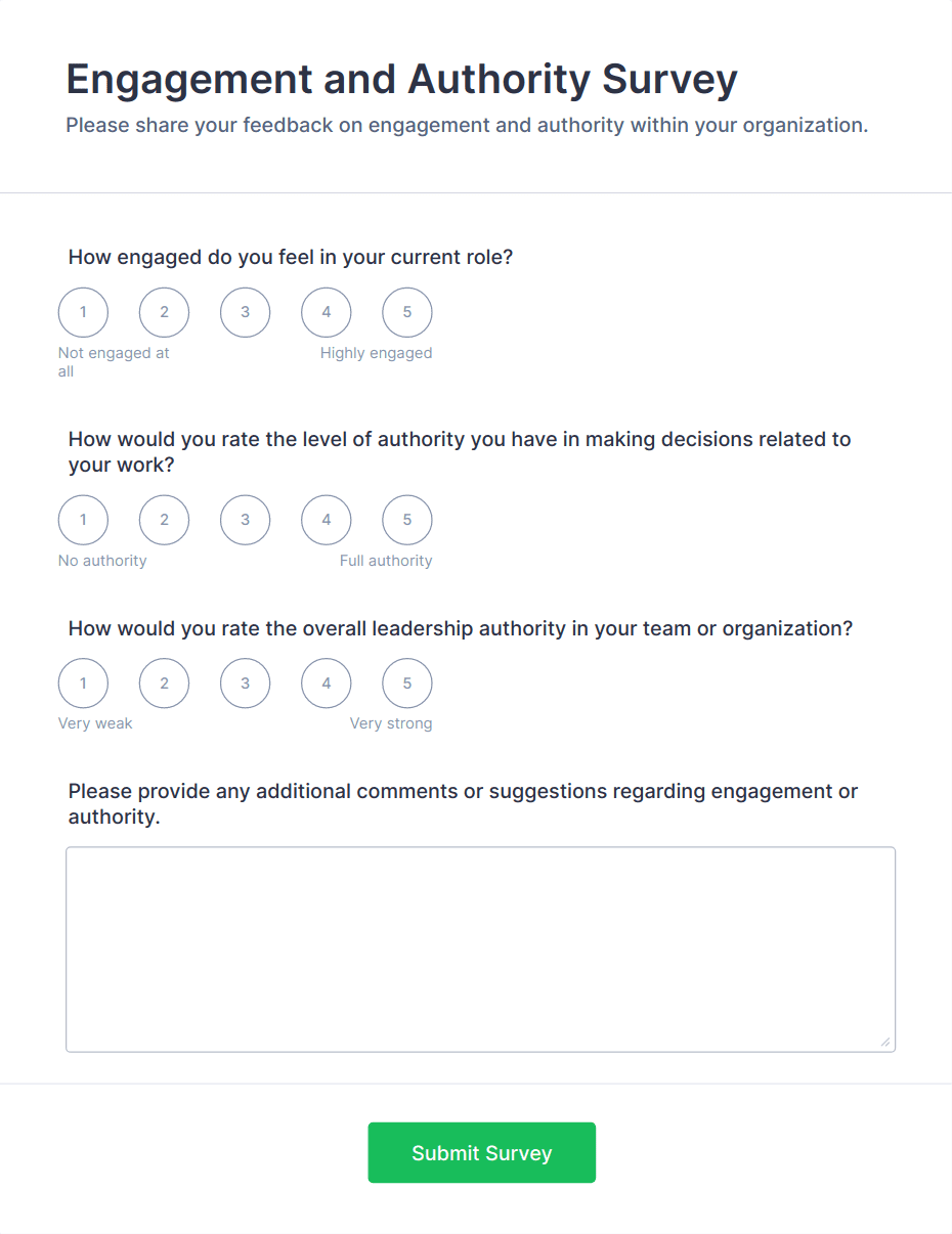 Engagement Survey Form Templates are specialized tools designed to help organizations measure and understand the level of engagement among their employees, customers, event participants, or community members. These templates are commonly used to gather feedback on satisfaction, motivation, workplace culture, event experiences, and overall involvement. By leveraging engagement surveys, businesses, educational institutions, and non-profits can identify strengths, uncover areas for improvement, and make data-driven decisions to boost morale, productivity, and loyalty. Typical use cases include employee engagement surveys, customer engagement feedback, volunteer satisfaction assessments, and event participation evaluations.
