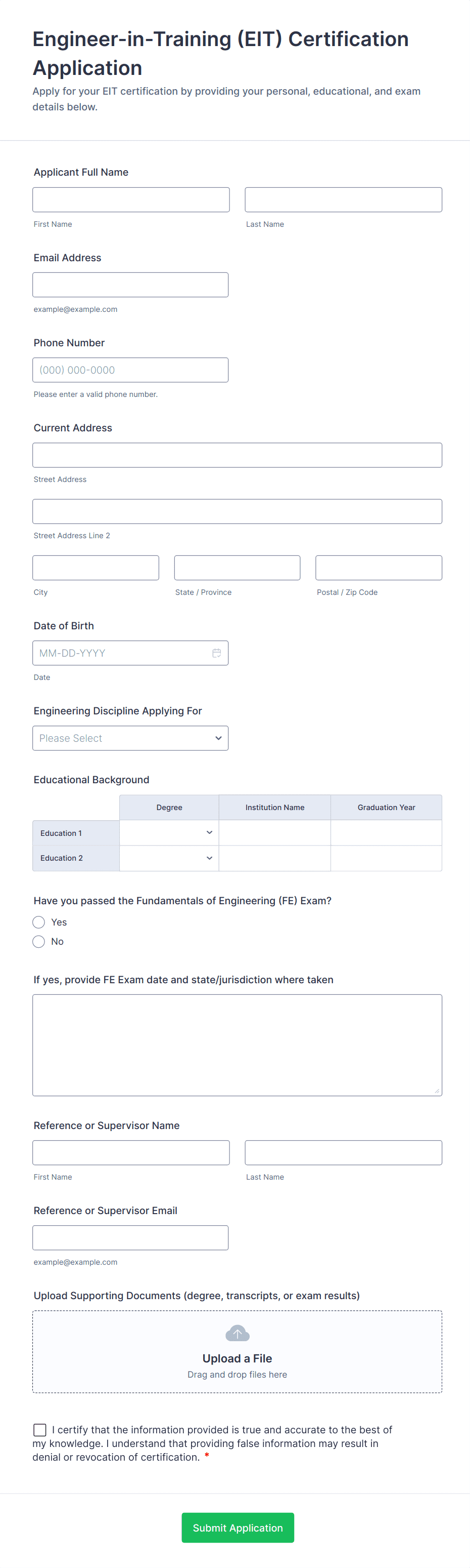• For job applications, include fields for personal information, education, work experience, references, and file uploads for resumes or cover letters.