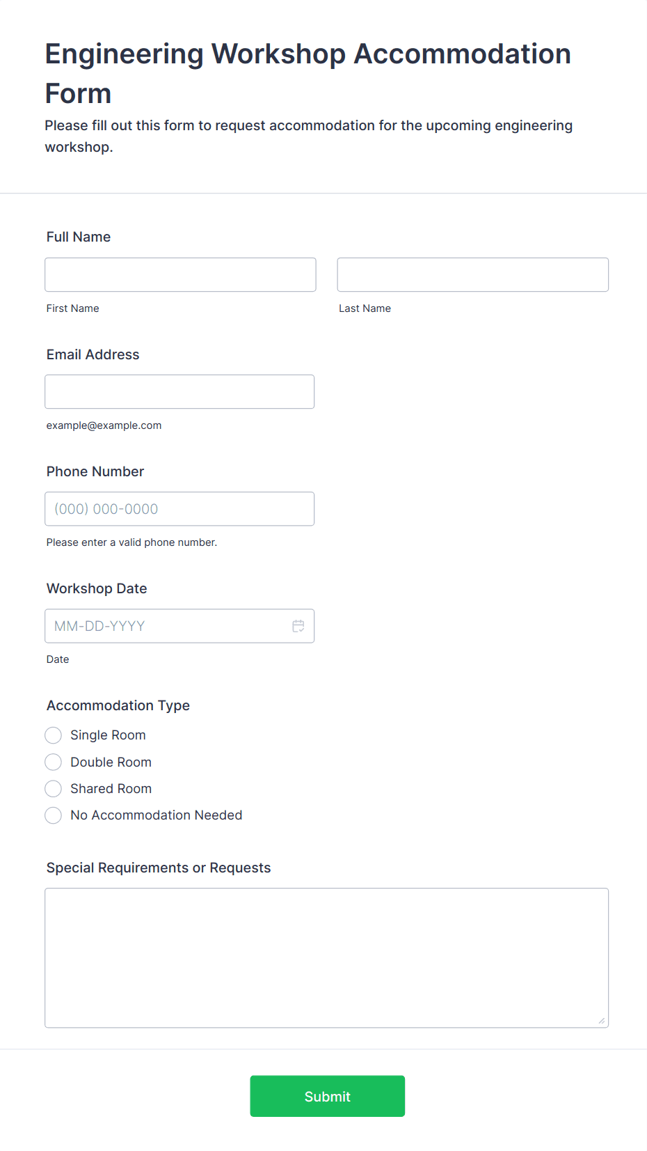 3. What information should be included in a workshop registration form?