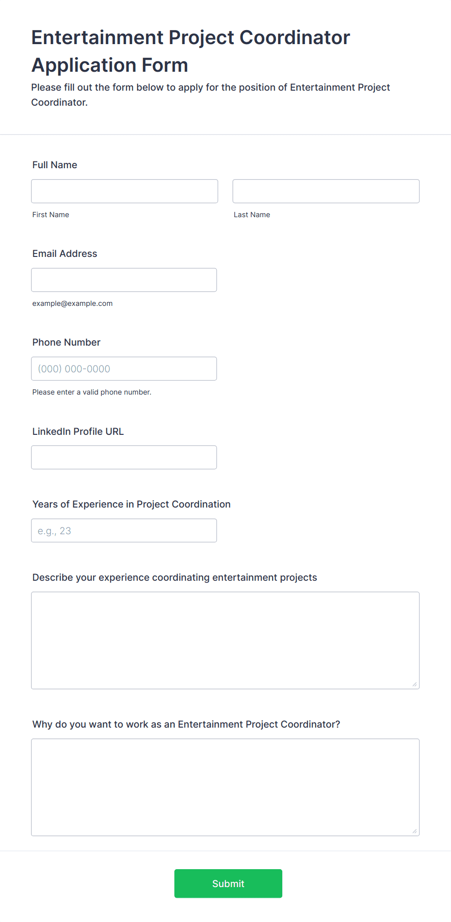 Entertainment Forms are specialized online forms designed to streamline processes within the entertainment industry, including event planning, talent management, audience engagement, and more. These forms can be used for a variety of purposes such as event registrations, ticket bookings, talent auditions, feedback collection, contest entries, and guest list management. Whether you’re organizing a concert, managing a film festival, running a comedy show, or hosting a virtual gaming tournament, Entertainment Forms help you efficiently gather and manage information from participants, attendees, and staff.