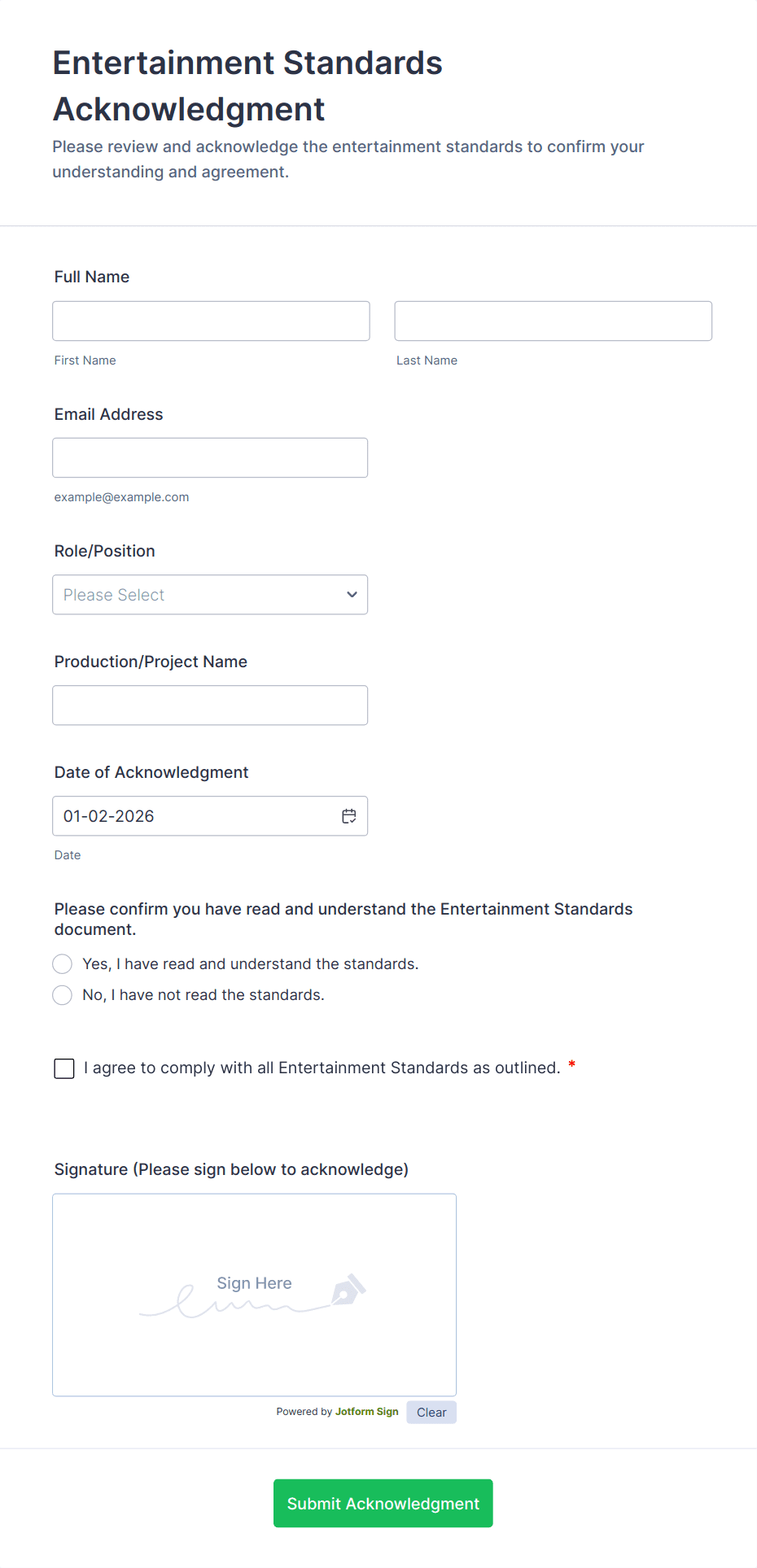 Entertainment Forms are specialized online forms designed to streamline processes within the entertainment industry, including event planning, talent management, audience engagement, and more. These forms can be used for a variety of purposes such as event registrations, ticket bookings, talent auditions, feedback collection, contest entries, and guest list management. Whether you’re organizing a concert, managing a film festival, running a comedy show, or hosting a virtual gaming tournament, Entertainment Forms help you efficiently gather and manage information from participants, attendees, and staff.