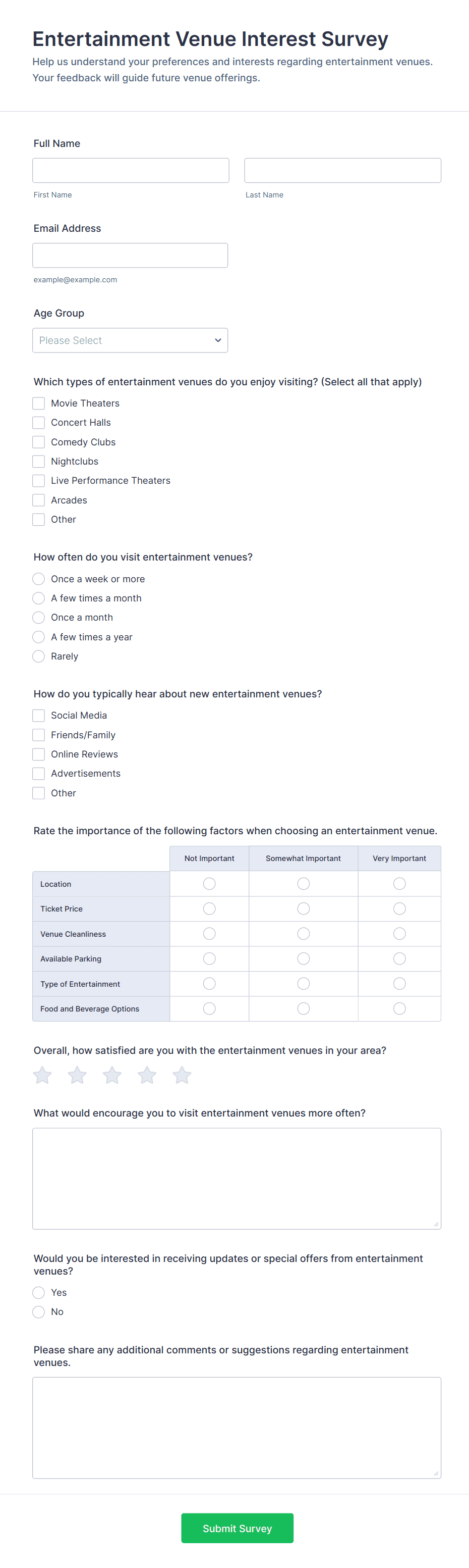 Survey templates are pre-designed forms that help individuals and organizations collect feedback, opinions, or data from a target audience. These templates are widely used for a variety of purposes, such as customer satisfaction surveys, employee engagement assessments, market research, event feedback, and academic studies. By providing a structured set of questions, survey templates streamline the process of gathering valuable insights, making it easier to analyze trends, measure satisfaction, and make informed decisions. Whether you’re a business owner, HR professional, educator, or researcher, survey templates offer a quick and effective way to reach your audience and collect actionable information.