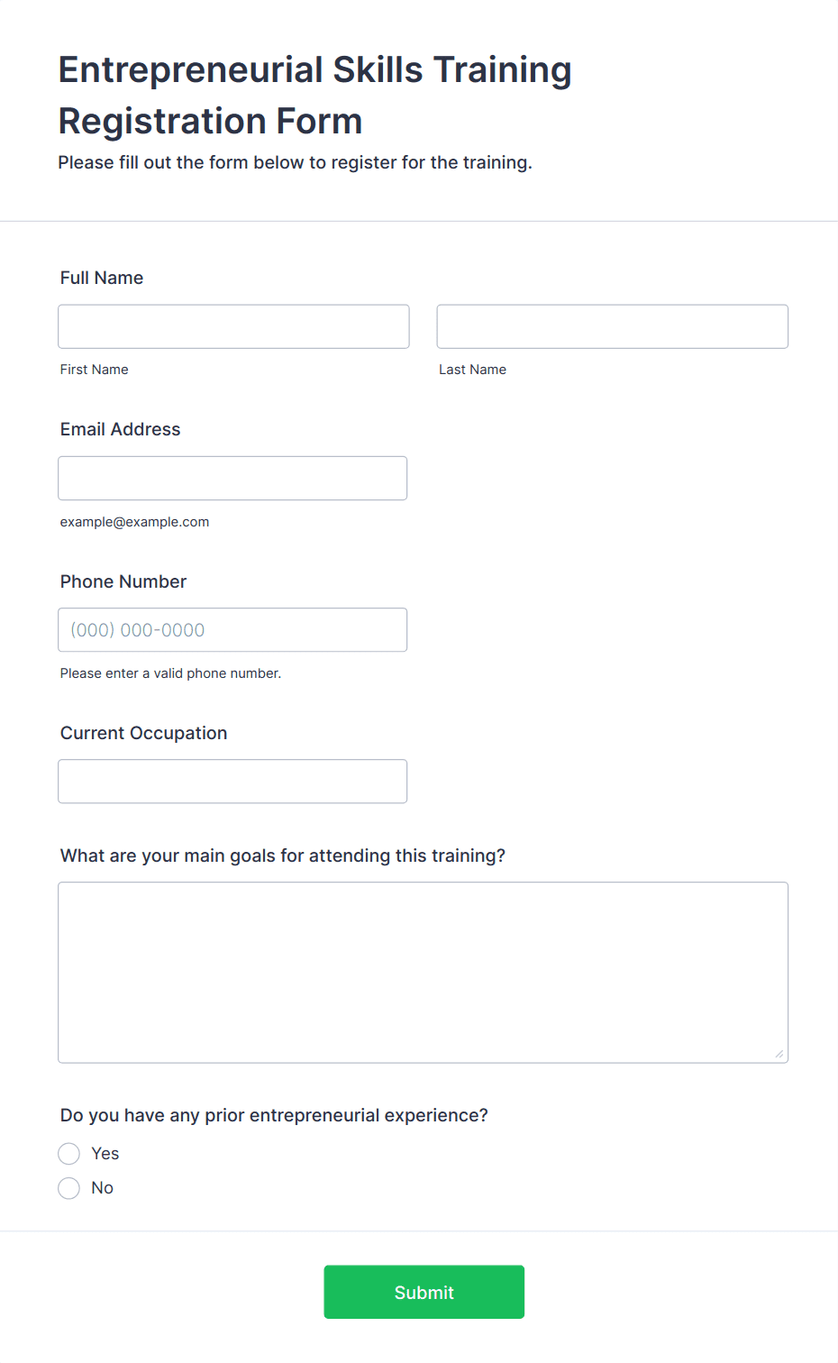 - Workshops and training sessions: Register participants, gather skill levels, and manage waitlists.