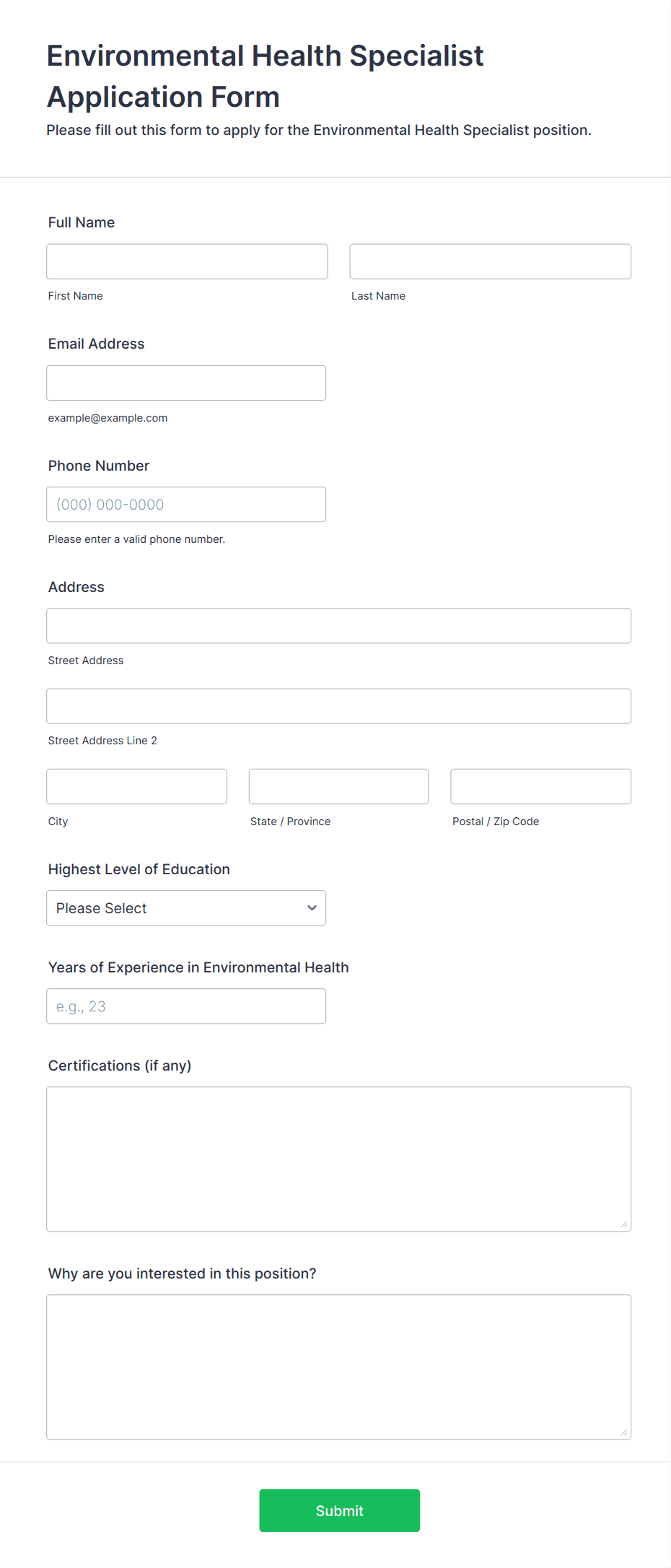 • For job applications, include fields for personal information, education, work experience, references, and file uploads for resumes or cover letters.