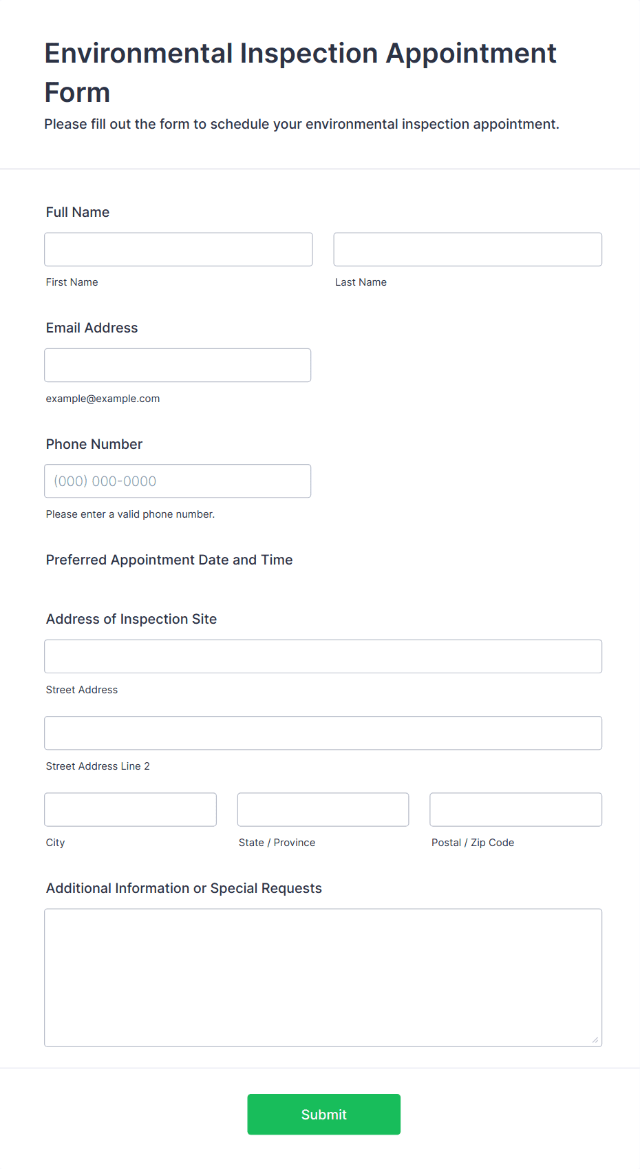 Typical fields include name, contact information, preferred date and time, type of service, and any specific requests or notes. Additional fields may be added based on the industry or service.