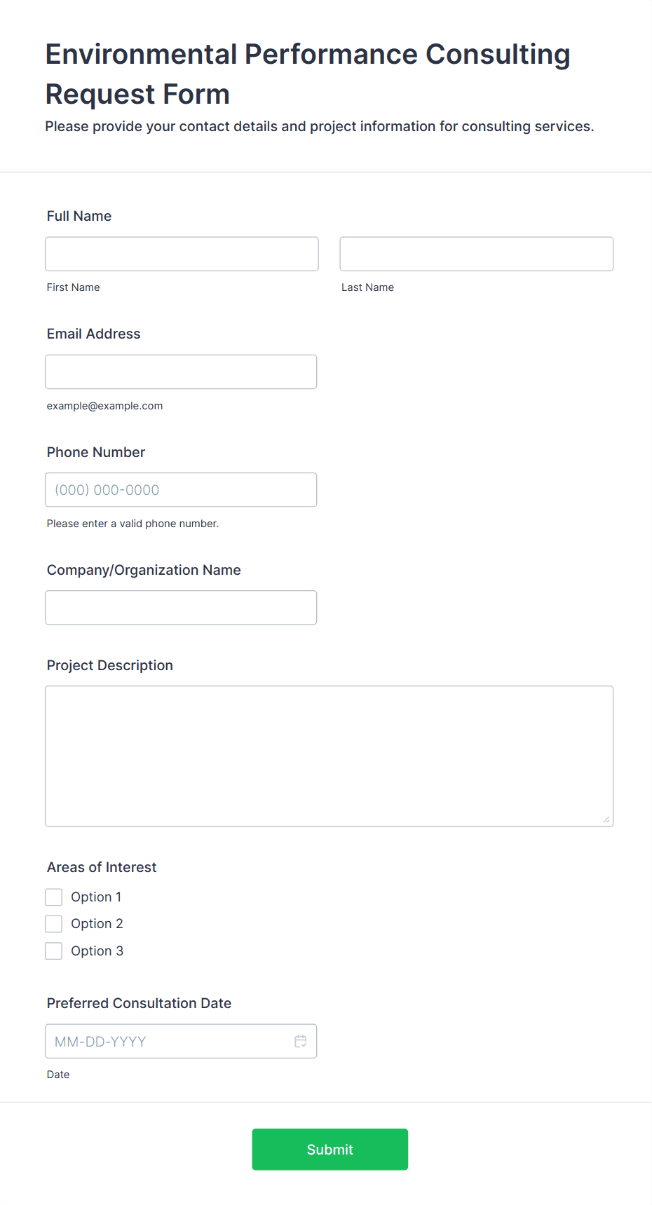 Consulting forms are specialized digital documents designed to streamline the information-gathering and communication processes between consultants and their clients. These forms can be used for a variety of purposes, such as client intake, needs assessments, project proposals, feedback collection, appointment scheduling, and progress tracking. Consulting forms help consultants efficiently collect essential details, clarify project scopes, set expectations, and document agreements, making them invaluable tools for independent consultants, consulting firms, and agencies across industries like business, IT, HR, marketing, and more.