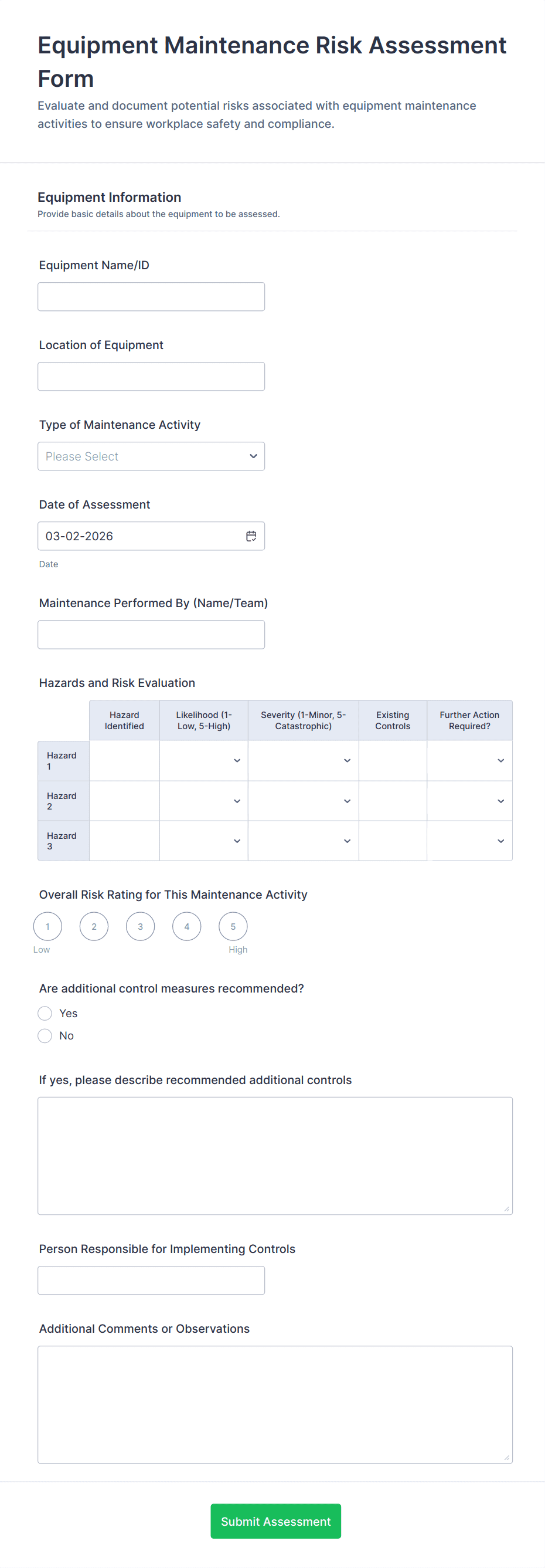 Equipment maintenance forms are structured documents used to report, schedule, and document maintenance activities for equipment and assets. They help teams track maintenance needs, record service actions, and maintain a clear history of repairs, inspections, and preventive maintenance. Equipment maintenance forms are commonly used in manufacturing, facilities, healthcare, laboratories, construction, and IT environments to reduce downtime and extend equipment lifespan. Typical workflows include maintenance requests, inspection logs, preventive maintenance checklists, repair reports, and service completion confirmations. By standardizing maintenance documentation, these forms improve response time, support compliance, and make maintenance planning more reliable.