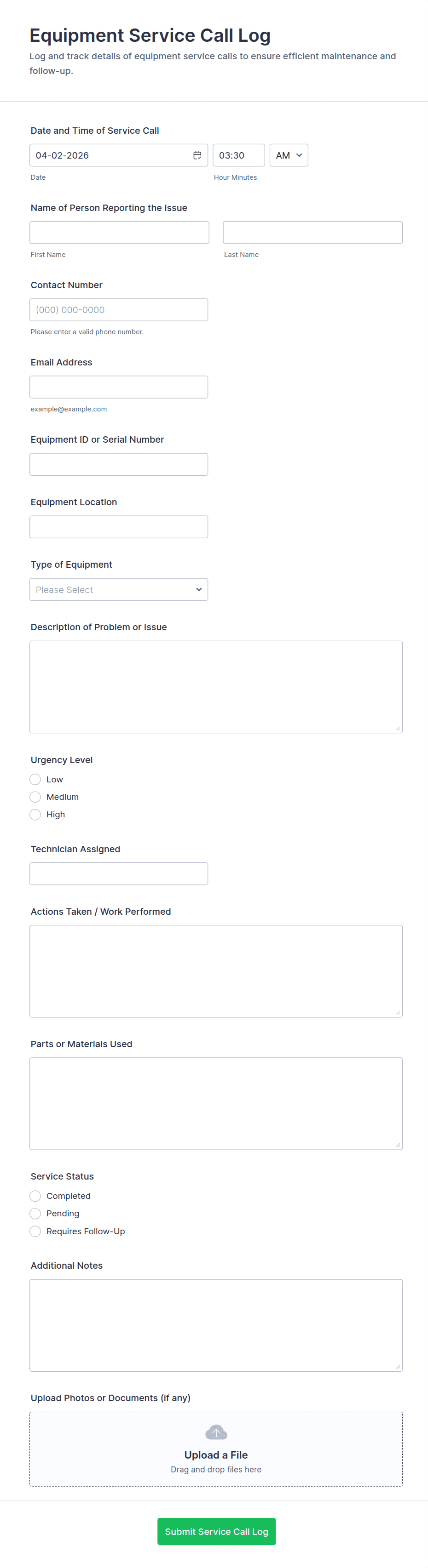 Include file upload fields for photos, invoices, technician notes, or service provider documents.