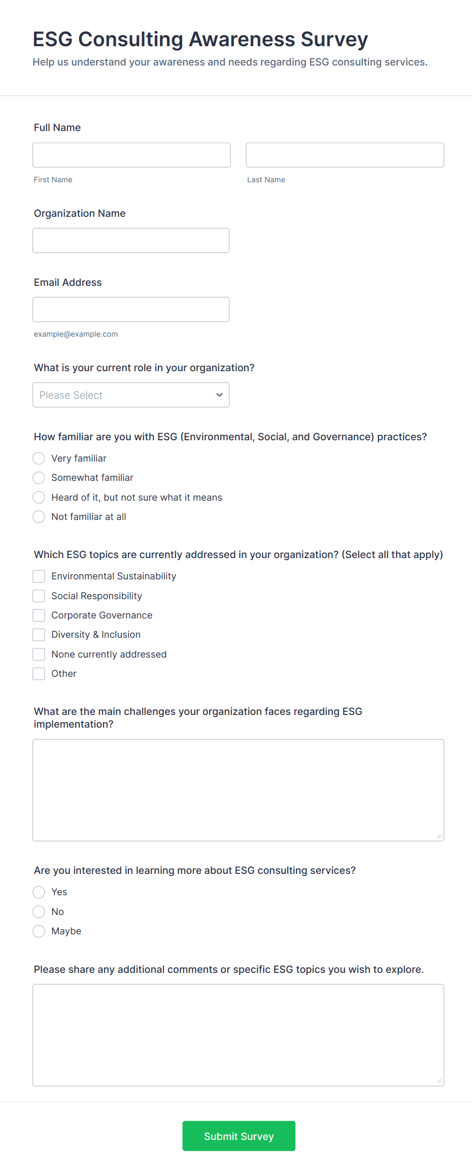 For employee surveys, consider adding anonymity options; for customer surveys, include contact fields if follow-up is needed.