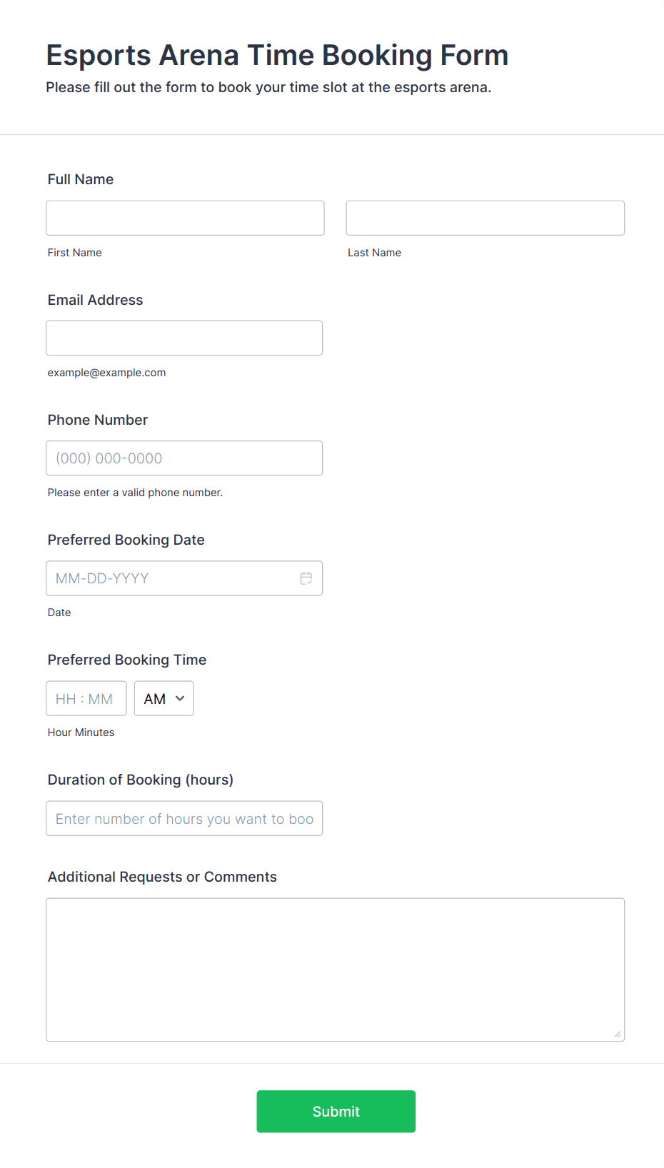 Common fields include name, contact details, date and time of booking, service or resource selection, number of participants, and payment information if required.