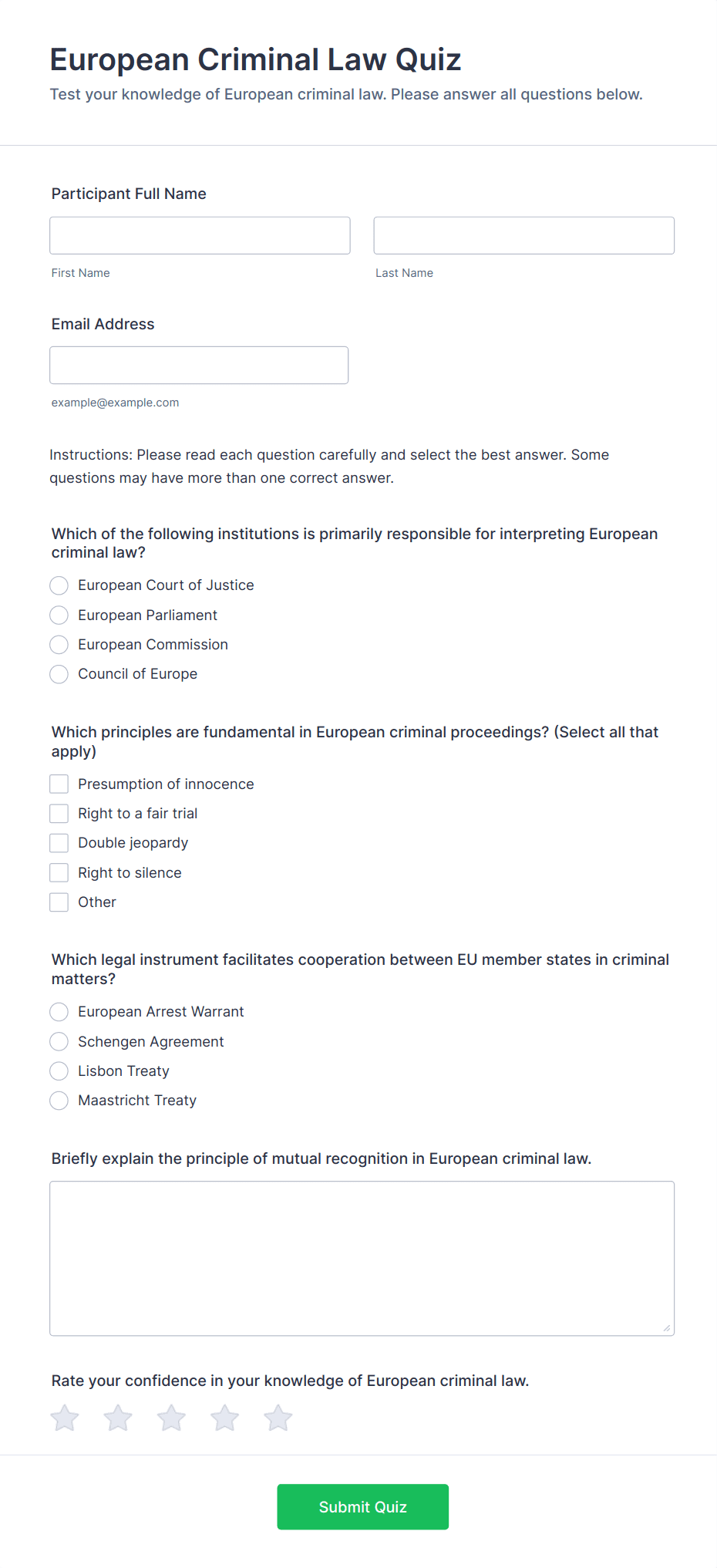 Quiz Templates are pre-designed forms specifically created to facilitate the process of building quizzes for a variety of purposes, such as education, employee training, lead generation, event engagement, and more. These templates provide a structured way to present questions, collect answers, and automatically score or evaluate responses. Whether you’re a teacher assessing student knowledge, a business running a product knowledge test, or a marketer creating a fun personality quiz, Quiz Templates offer a flexible foundation to suit your needs. They can be used for online exams, trivia games, onboarding assessments, customer feedback quizzes, and interactive learning modules.